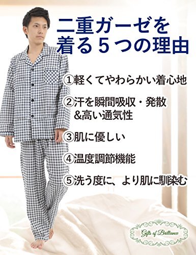 商品説明 | [■気持ちよく眠れるガーゼパジャマ ]パジャマメンズガーゼ長袖です。紳士パジャマ長袖、男性パジャマ、秋冬も使える綿100のコットンパジャマをお探しの方に、ガーゼパジャマメンズをお勧めします。※サイズ目安は下の"続きを見る"参照 [■さらさらの肌触り ]メンズガーゼパジャマの通気性に優れたコットンが、ムレを防ぎ、男性の快眠をサポートします。 [■オーガニックな安らぎ ]健康の基盤である睡眠のために、毎日着る寝間着にも気を配る方に、Gifts of Brilliance(ギフツオブブリリアンス)のガーゼパジャマ メンズが人気です。 [■パジャマをプレゼント ]毎日必ず使うものとして、10代から高齢者の紳士用パジャマまで、大切な方への誕生日や記念日、日頃の感謝のプレゼントとして上質で高級感あるパジャマガーゼメンズが人気です。 [ ※サイズ対象身長目安(cm) ]M=165-175、L=170-180、XL=175-185