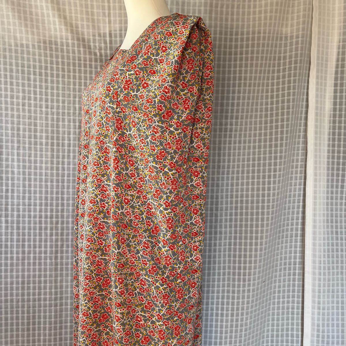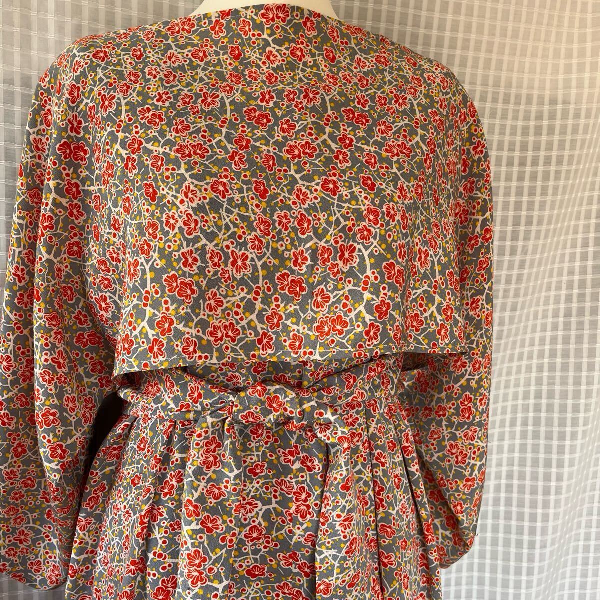 地色は明るい桜鼠色で梅の模様が一面に描かれた着物をリメイクしました。