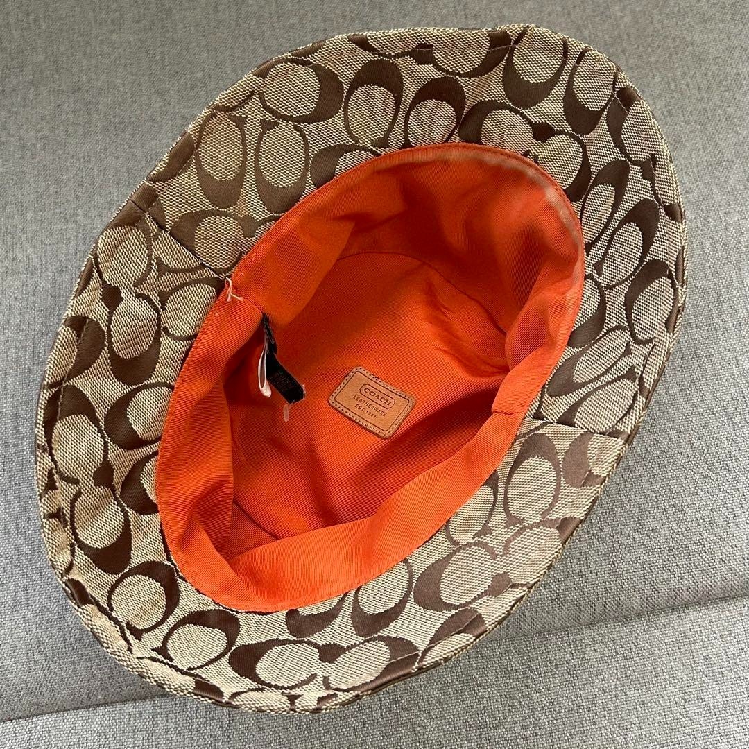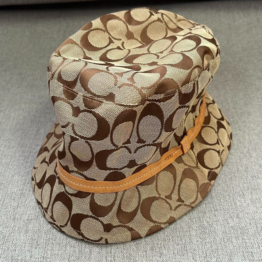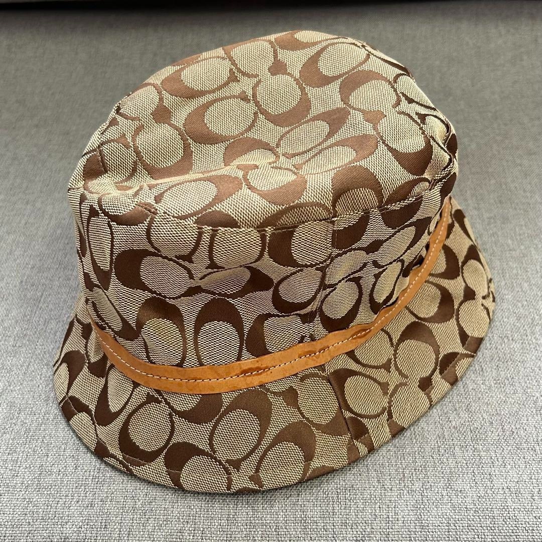ブラウンのキャンバス素材に レザーのバンドが施されており シンプルながらも高級感があります。バケットハットの形状はカジュアルなスタイルにぴったりです