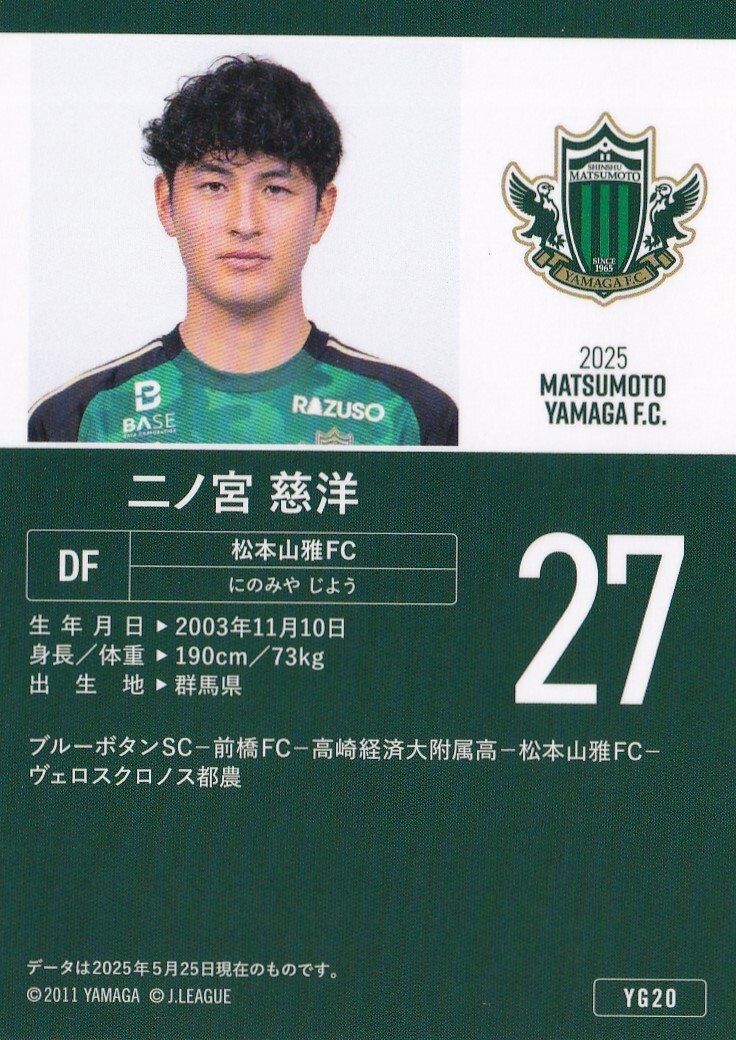 松本山雅FC 2025 オフィシャル YG20 二ノ宮慈洋