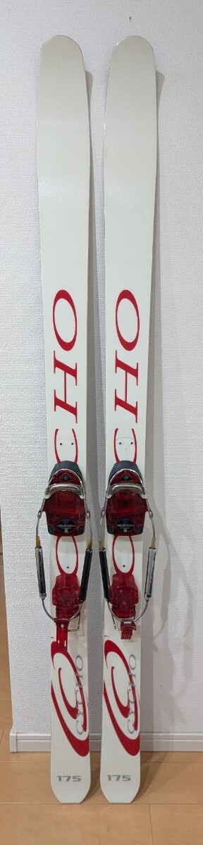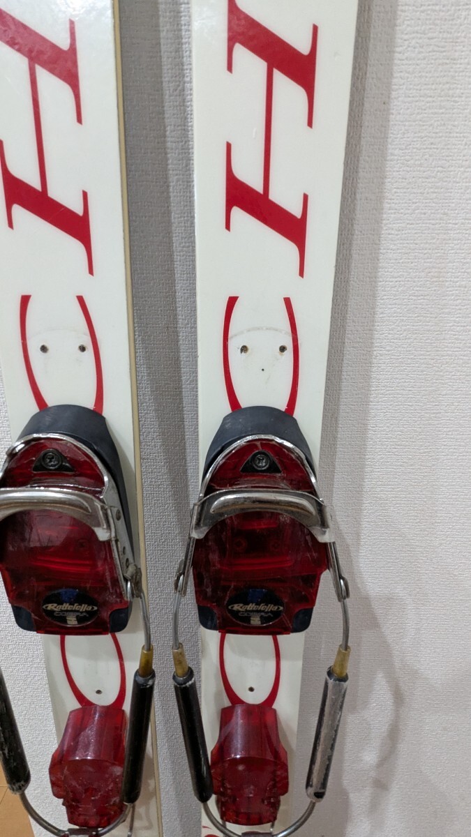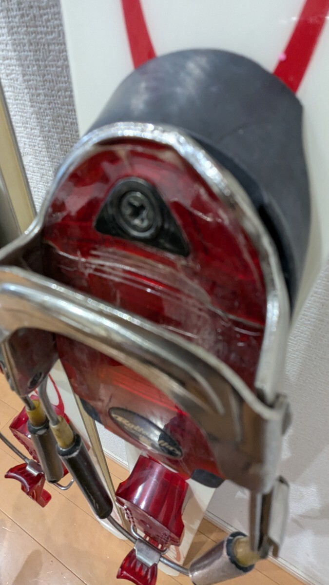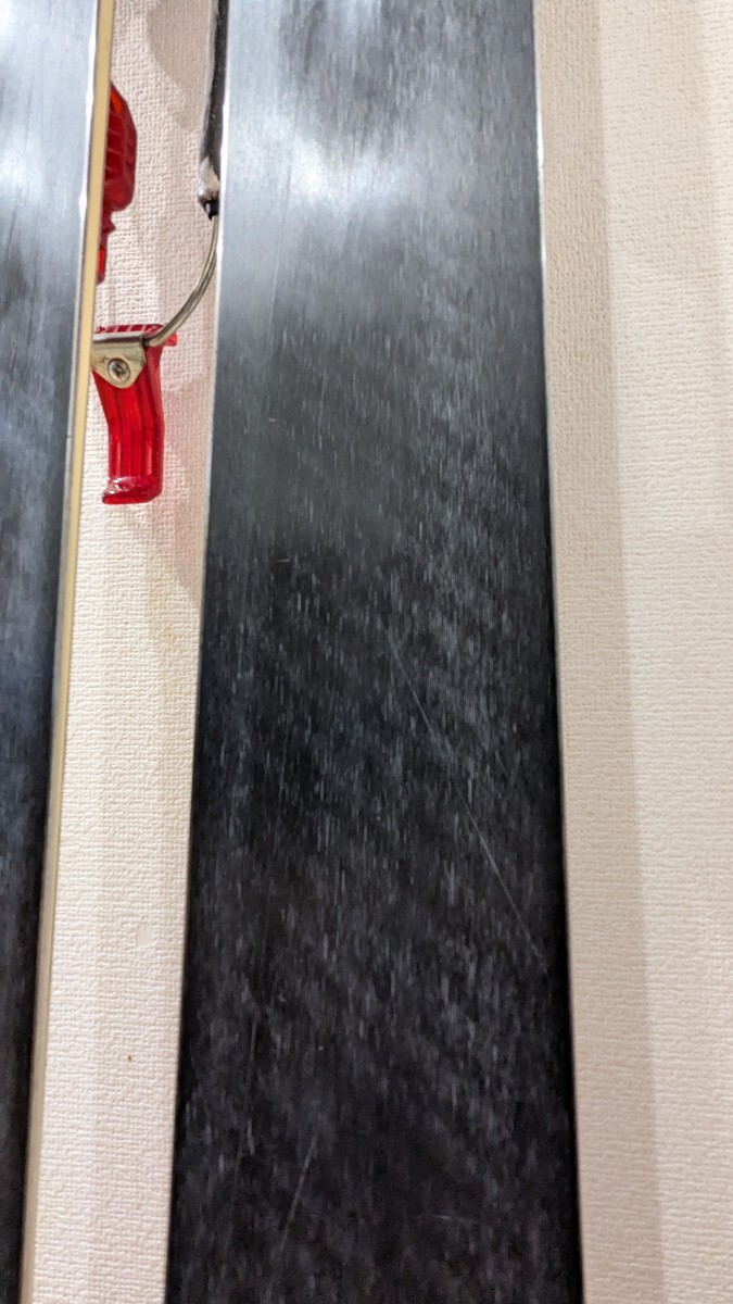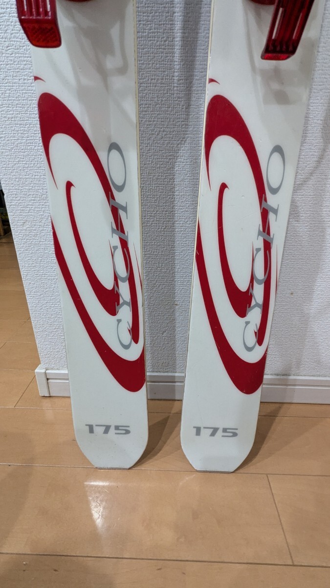 サイコスキー テレマークスキーです。ビンディング取り付け位置が元々、センターだったのをスタンダード位置に付け替えて履いていました。素人作業の為、少し斜めにヒールピース取り付いています。ストラクチャー入っている為、よく走ります。ヘタリあります。中古品の為ノークレームノーリターンでお願いします。