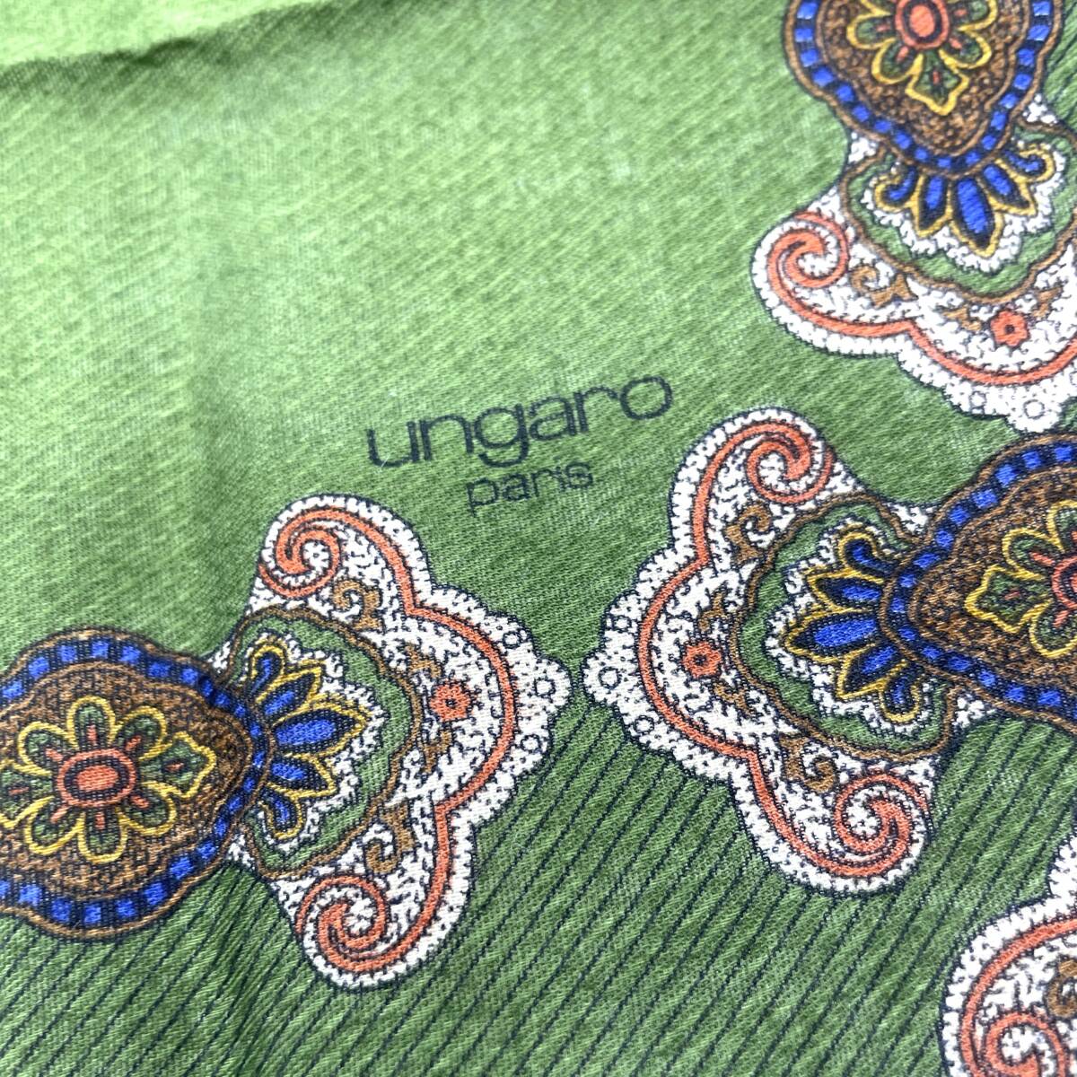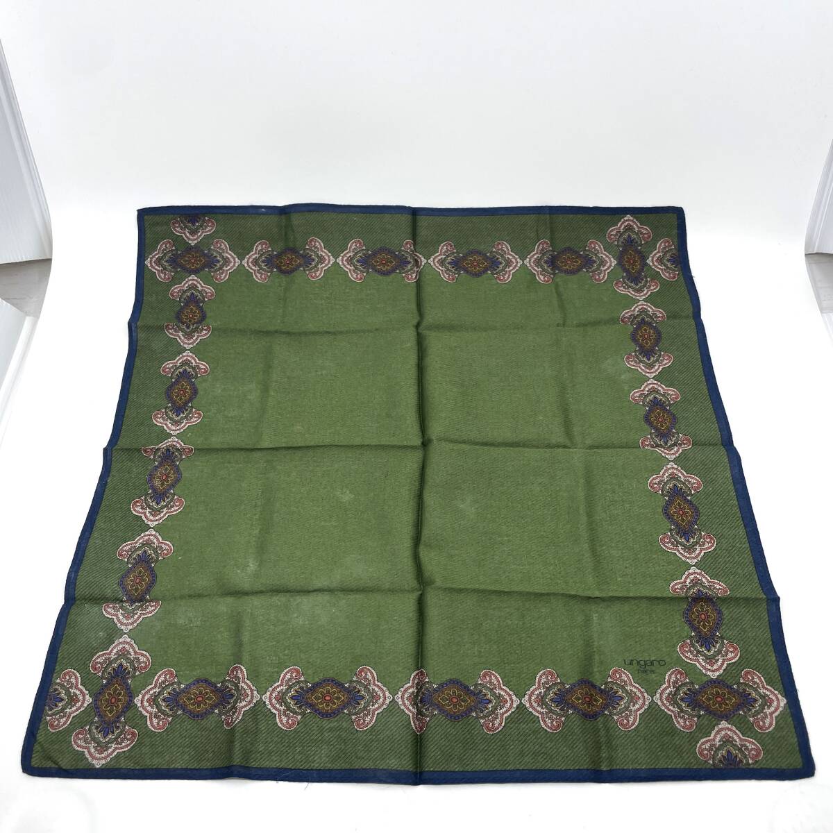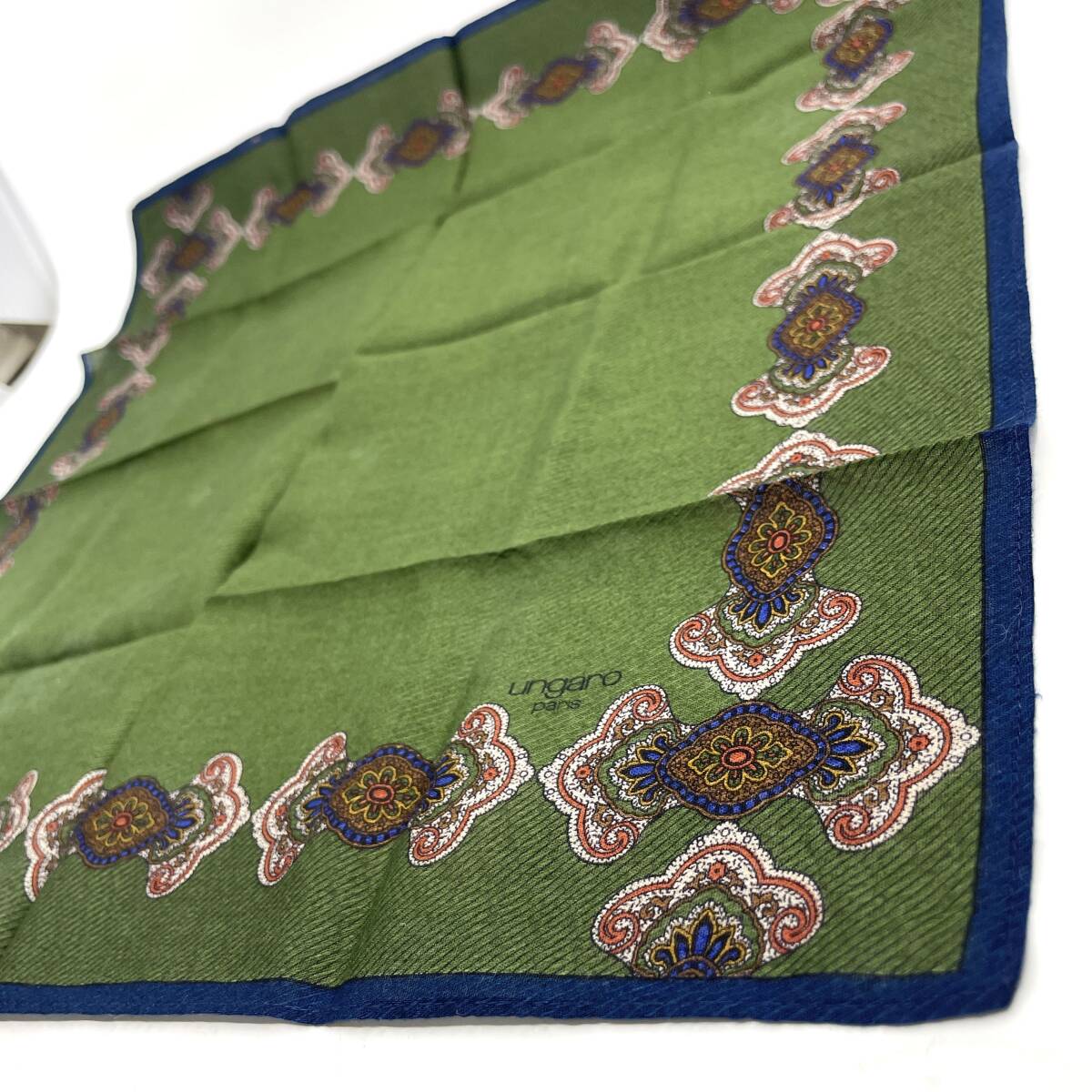 【保管ダメージ有り】ungaro ウンガロ ハンカチ バンダナ グリーン系 縁ブルー 斜めストライプ ラグジュアリー エレガント
