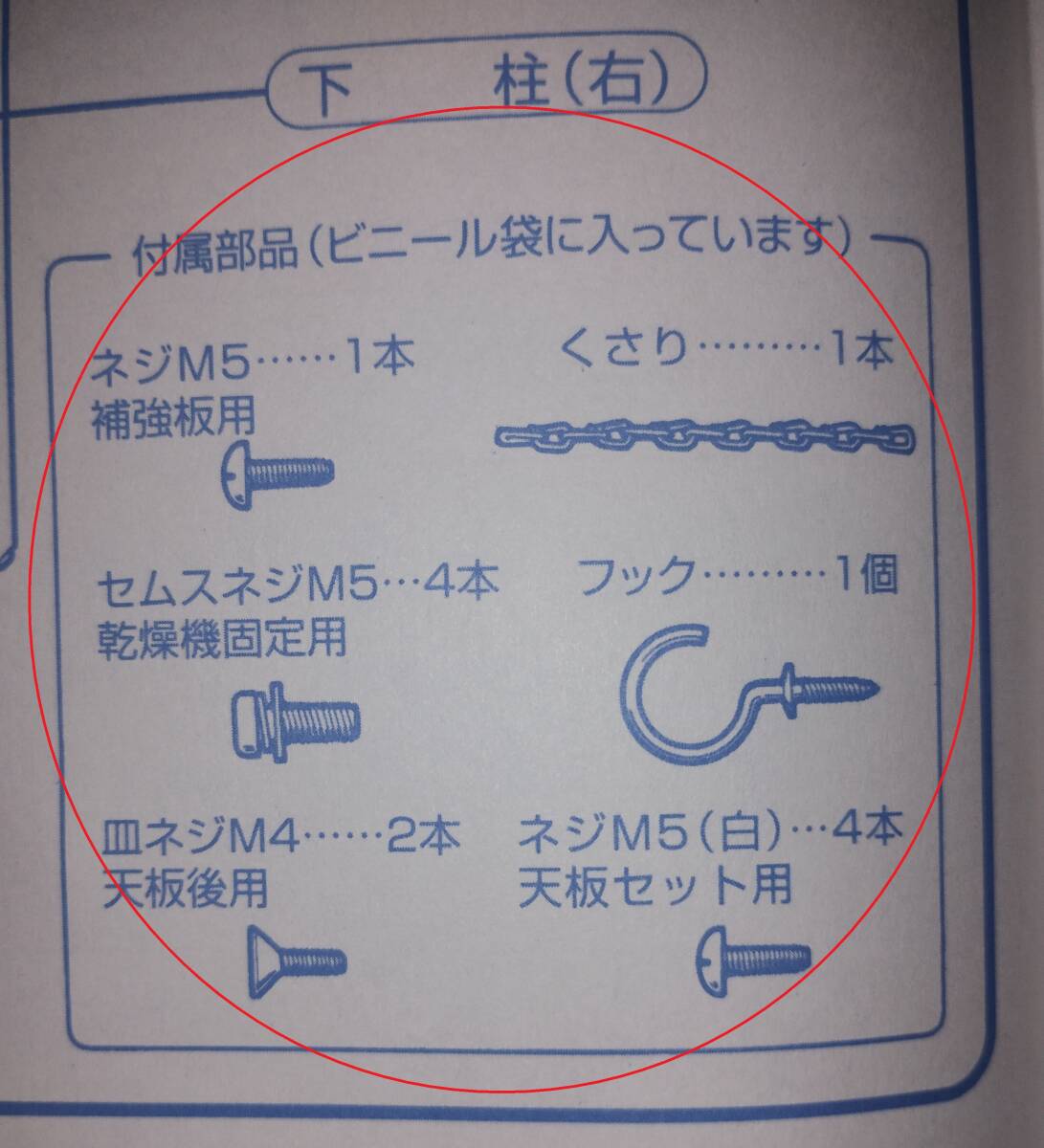確認したところ、 ネジ・フック・鎖など付属部品がすべて欠品 しております。
