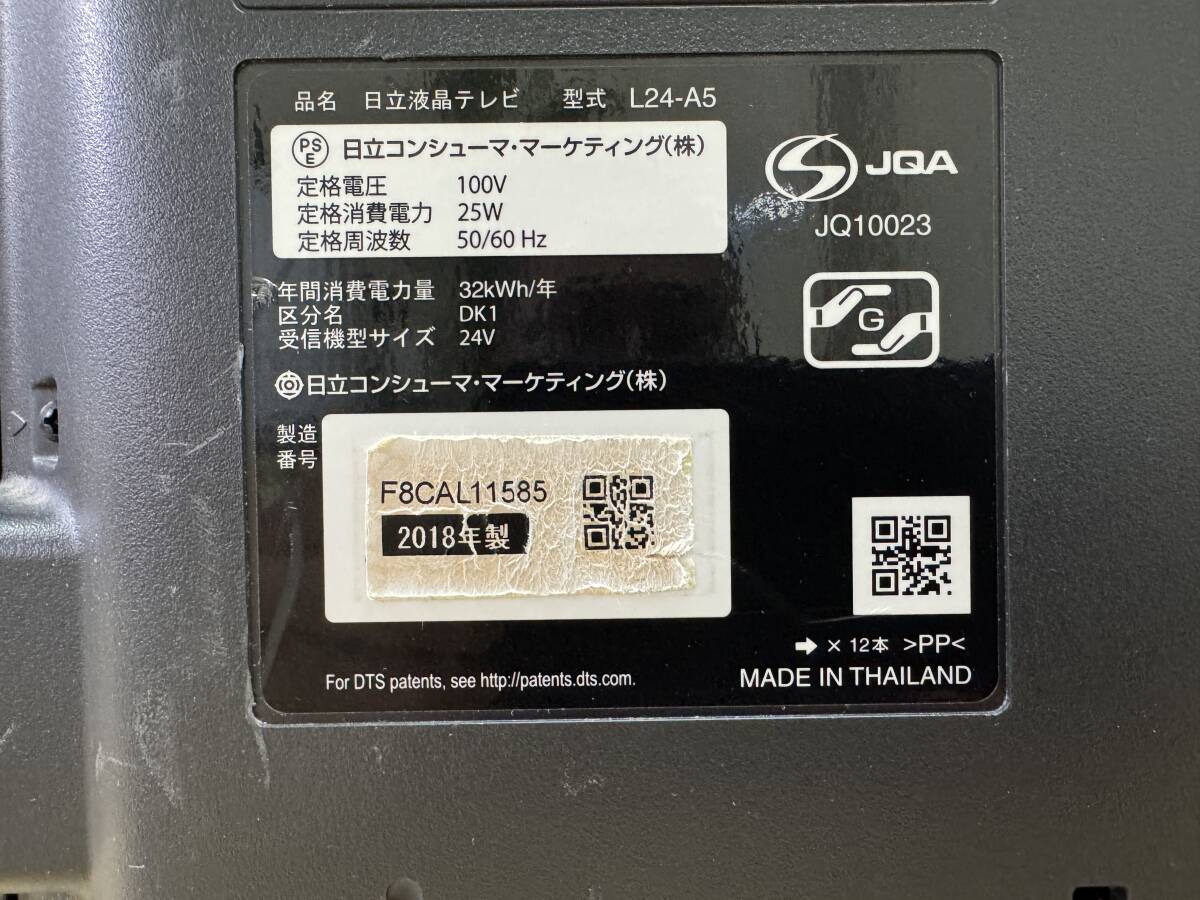 24型 日立 Wooo  LED 液晶テレビ 2018年製 L24-A5 ダブルチューナー搭載 外付けHDDを繋いで裏録画可能 管理番号F1568