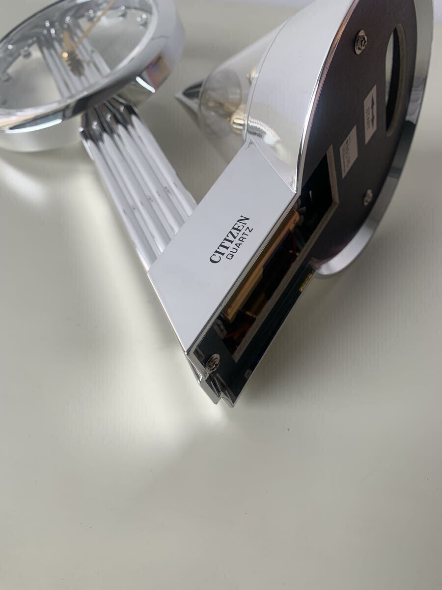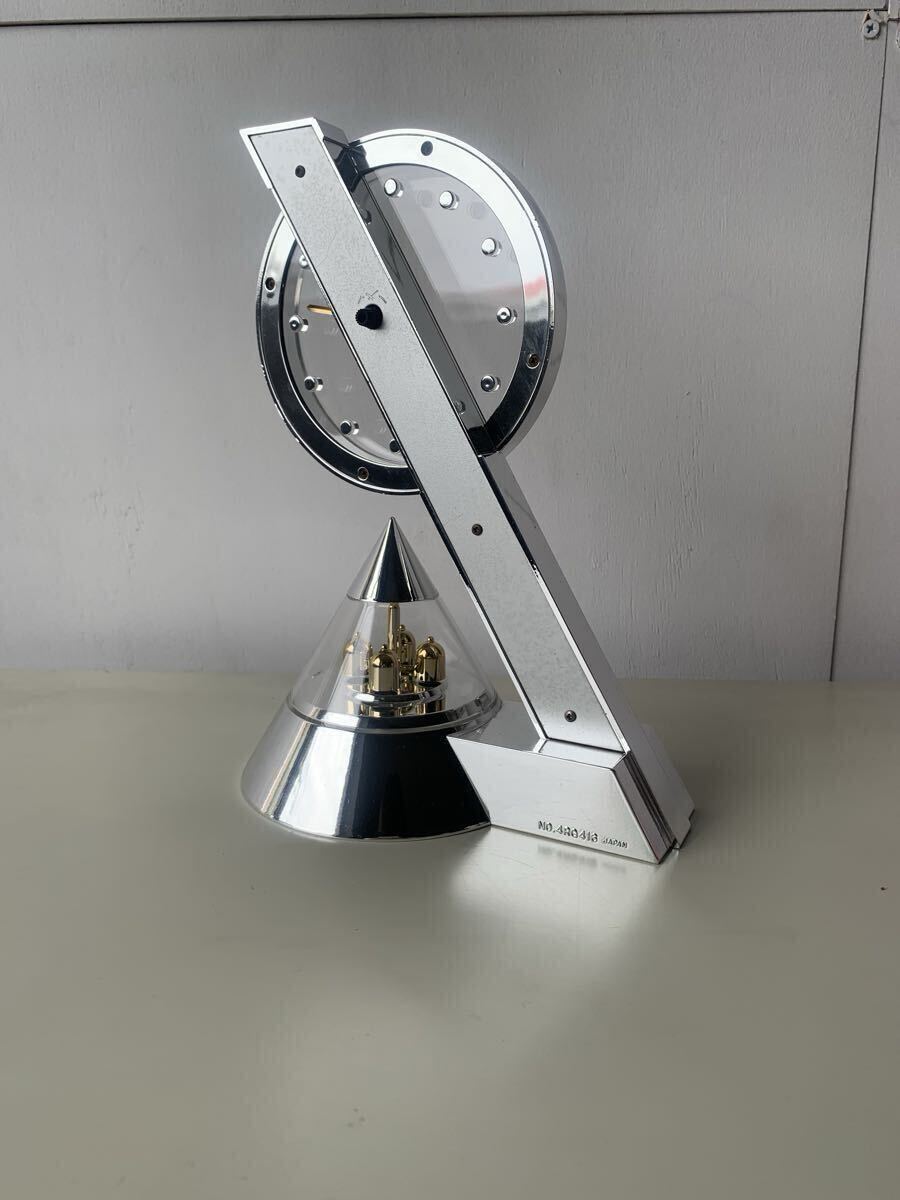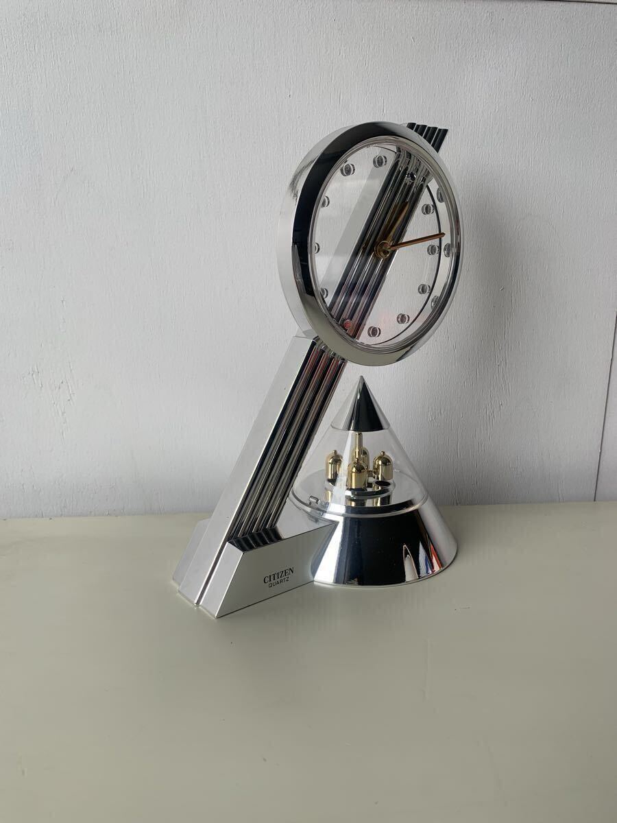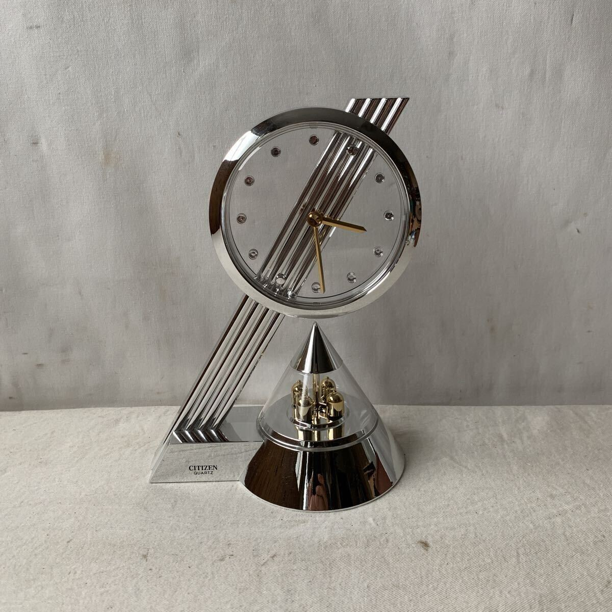 可動品 デザインが素敵なCITIZENの置き時計です。日本製。三角部分の中の部品がくるくる回ります。お部屋のインテリアやお店のディスプレイにいかがでしょう。電池は付属しません。画像の通り、電池カバーがありませんが、使用に問題ありません。