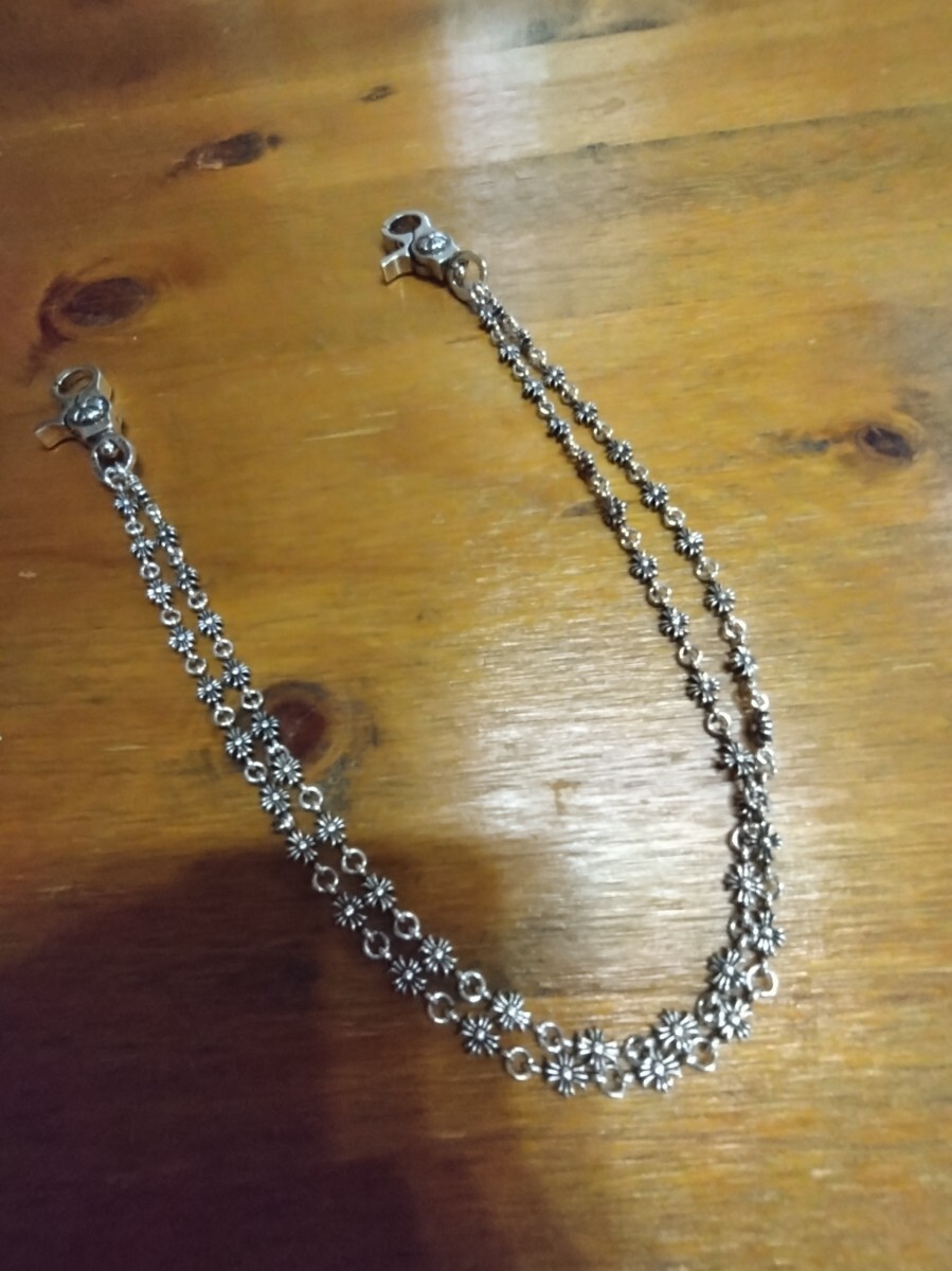 クロムハーツタイプのウォレットチェーンです。シルバー925刻印あり、全長51センチほどの物です。あまり使うこともなく保管致しておりました。お探しの方いらっしゃいましたらよろしくお願い致します。一度人の手に渡った中古品ですので神経な方や完璧な物をお求めの方は入札しないで下さい。オークションを取り消すこともございますのでご理解下さい。