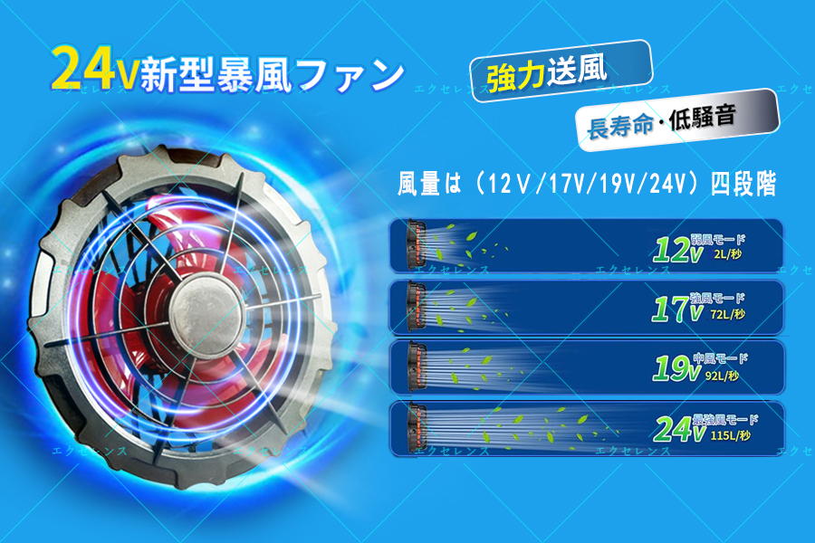 | 商品説明 | ★【セット内容】 30000mAhバッテリー*1、 ファン*2 、 DC接続ケーブル*1、 接続ケーブル*1 。 ★【24V超高出力&作業服専用 ファンバッテリーセット】夏最新、空調作業服ファンは航空力学を応用した流線型3枚大面積羽根が搭載して、風の抵抗を35%低減し、風が中心に集まり直進性が高く、パワフルな風を生み出します。30000mAh大容量専用バッテリーが搭載され、ワンボタンで12V-17V-19V-24Vに4段階切り替えるだけでなく、同類製品に比べると24V最強風量モードでもパワーが一定で、風量が弱くならないでずっと115リットル/秒で服内に暴風を送ります。真夏のべたつく汗、焼けつくような日差し対策として活躍します。 ★【24V超高出力&30000mAh大容量&4段階風量調】24V高出力バッテリーは、暑い夏の作業環境を一変するパワフルな大風量を実現!更に、30000mAhの大容量があり、24Vで10~12時間まで連続稼働できます。驚くほどの爆風が、より長時間維持できます。 DCケーブルで作業服ファとバッテリーを接続して、バッテリーの電源ポタンを押すと、12V-17V-19V-24Vの順番に調整できます。 ★【取り付け簡単】ファン取り付け部の直径サイズは9cmで、市販の90%の空調作業服、空調ベスト、空調パンツに対応でき、互換性が非常に高いです。何の道具も使わず、両手で空調作業服ファンカバーを回すだけで、2秒で簡単にファンカバーを取り外すことができます。ケーブルの接続不良はファンの電力供給が不安定で自動的にオフになるが、この新型扇風機にはプラグ固定用のフックを追加して、プラグをしっかり固定することができ、接続が緊密になり、ファンへの給電がもっと安定となります。アウトドア、ガーデニング、倉庫作業、農作業、建築現場、運送業などの作業着としてはもちろん暑さ対策ウェアとしても完璧です。 |