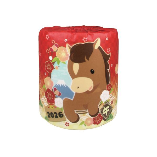 ★年末年始の【販促用】【贈答用】【イベント】【積み上げ景品】に最適です★ 令和8年・2026年の干支は『午(うま)』 可愛らしい馬さんキャラクターのトイレットペーパーです お健やかに新年をお迎えになられますよう福を招く縁起のよいお正月デザインです 午は「物事が”うま”くいく」「幸せが駆け込んでくる」などと言われる縁起の良い動物とされています 大切なお客様への贈り物、福引きの景品、年末年始のご挨拶や販促品に是非ご利用ください 原紙には富士山の雪どけ水を使用しています 【商品詳細】 ロールサイズ: 114mm×27.5m ダブル(2枚重ね) ケース入数: 100個 ミシン目: 有り 色・表面: 白 香り: 無し 絵柄: 無し 紙の材質: 再生紙100% 枚数: ダブル ケースサイズ: 515×515×480mm 梱包方法:紙巻き個包装 重量(1ケース): 約12kg 用途: 販促用・贈答用・景品用・記念品・粗品 製造国:日本 販売製造メーカー:林製紙株式会社 製品名:干支1R 型番:2979 |