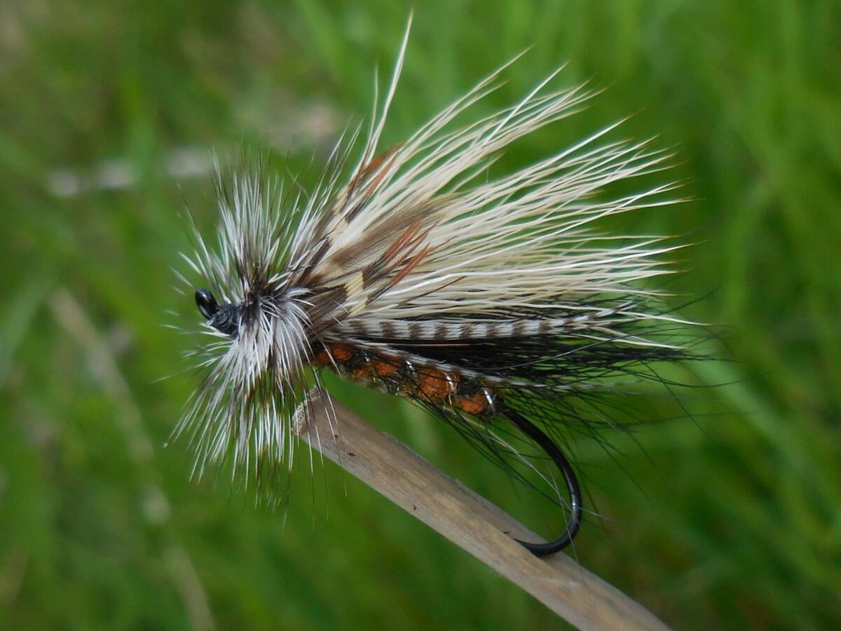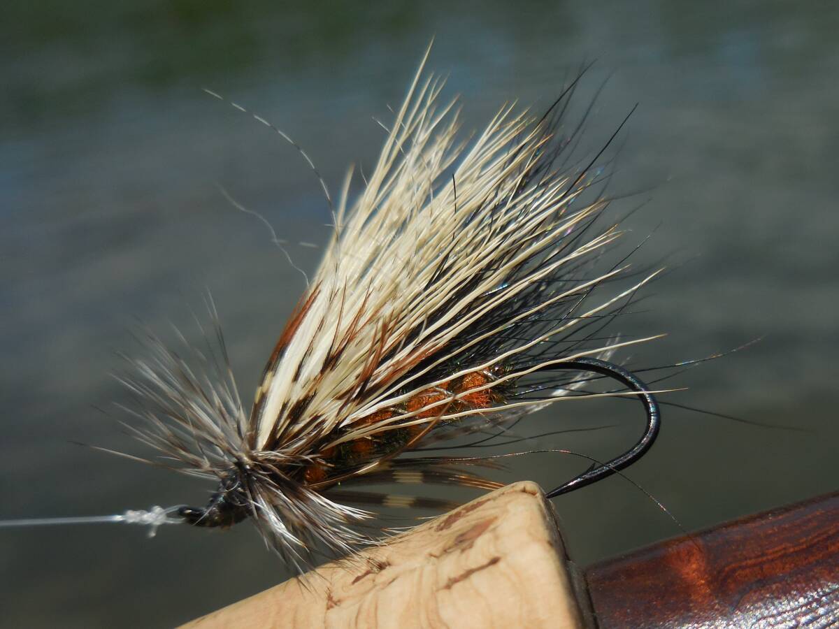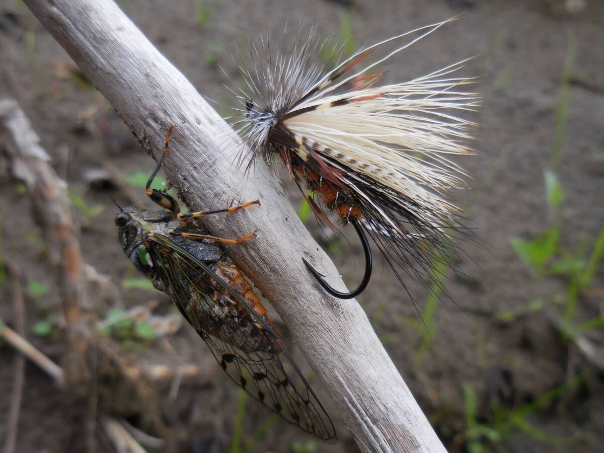 エゾハルゼミを意識した作りですが、初夏~秋まで長い時期の使用を考えた色合いに仕上げています。本物っぽい作りだと反応は良くてもフッキングが悪い場合が多ですが、エルクヘアーを用いたカディス仕様なので比較的掛かりは良いと思います。