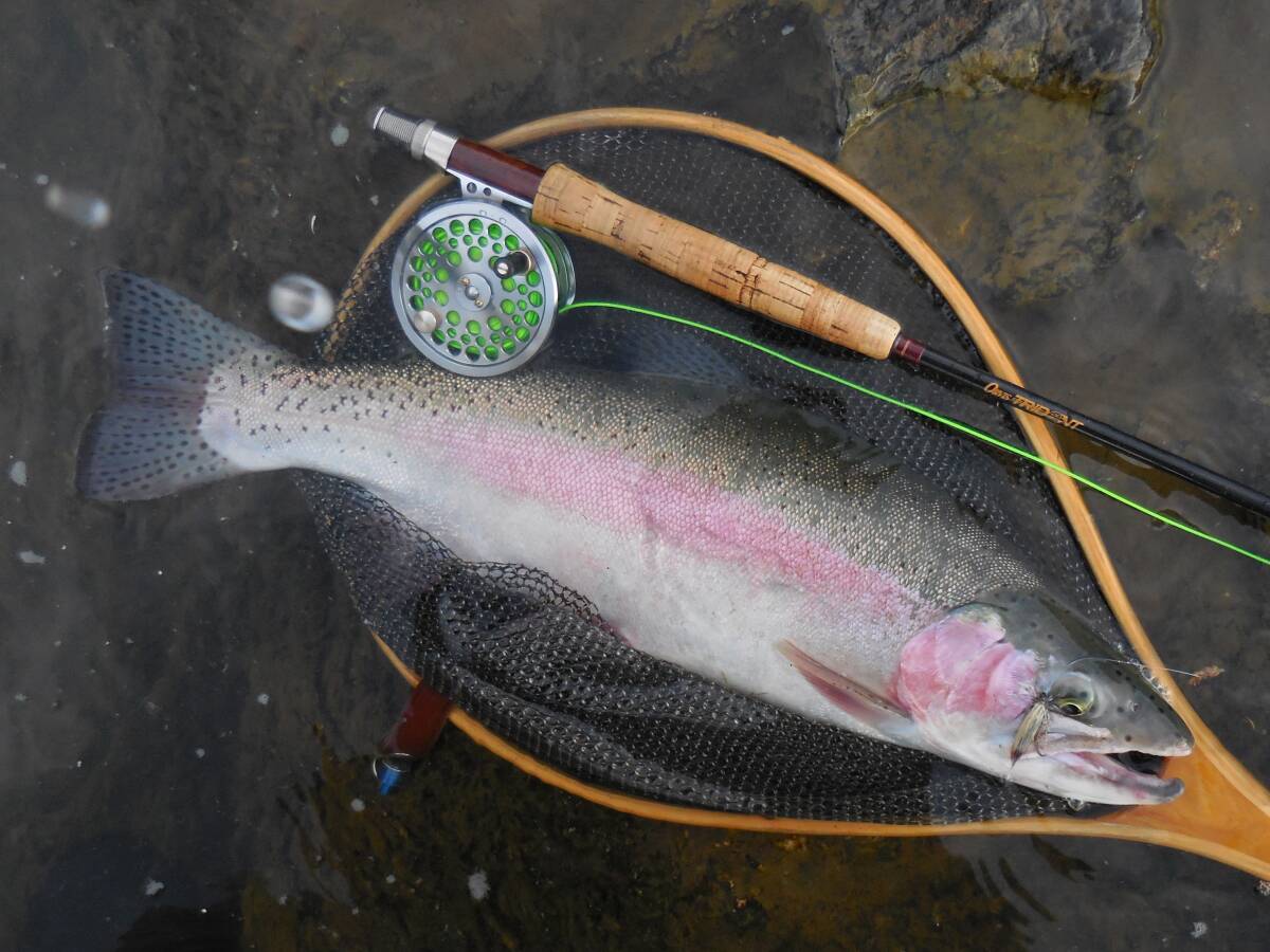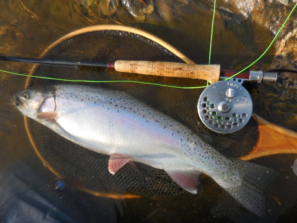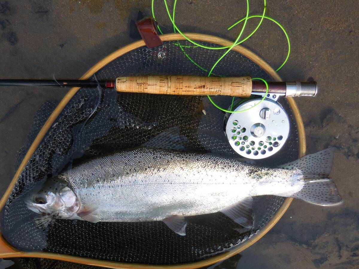 大きな本流でのドライの釣りは初めてでした。良く晴れた日中、ライズの無い中に当フライを流すとすぐに50cmクラスが出ましたがバラシ。続いて更に大きいのが喰ってきましたが合わせが効かず。しばらく無反応の状態が続きポイントを移動。そちらではライズがあり、45cmクラスを釣り、同サイズくらいのを2匹続けてバラシました。更に別なポイントでは57cm、51cm、55cmと3匹連続で大型のニジマスが掛かり、非常に反応が良かったです。