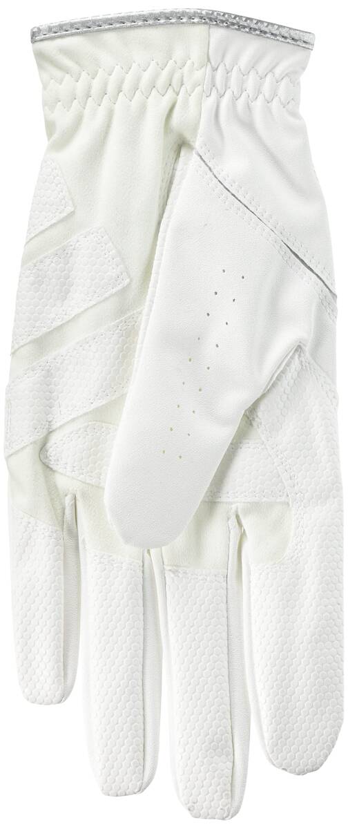 “ウェット時もしっかりグリップ! " 雨や汗に濡れてもすべりにくい素材を使用し、ウェット時にも強力グリップ。裏面のグリップ加工により、グローブと手のズレを軽減。平側下には柔らかく伸縮性に優れたスウェード調合成皮革を配置し、高いフィット感とグリップ力を提供。独自設計された"スリーバーグリップ"により、平側の浮きをおさえクラブをしっかりと握ることができる。甲側に合成皮革を採用することで従来よりもグローブ内への水滴の浸透を軽減。さらに屈曲部にストレッチニットを配置することで、伸縮性とフィット感が向上しグリップをサポート。濡れてもグリップ力を落としたくないゴルファーに向けた全天候性型グローブ。