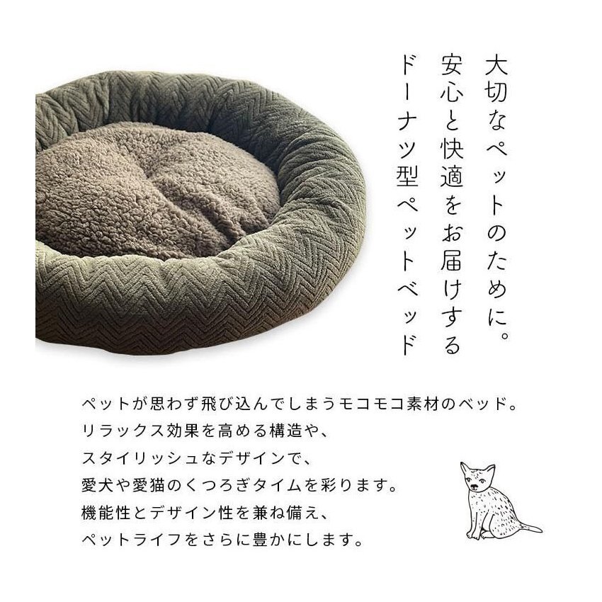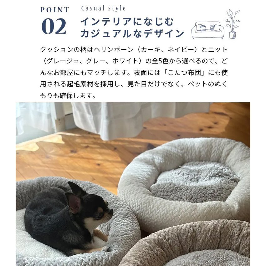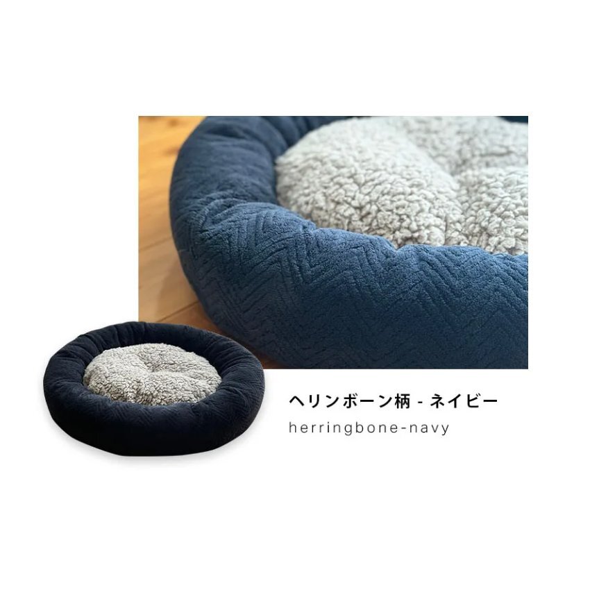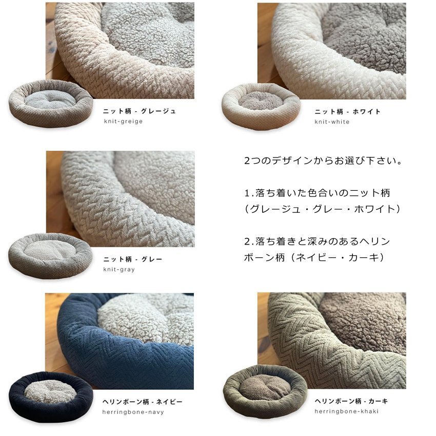 | 思わず飛び込んでしまうようなふわふわ構造のドーナツ型ペットベッド。リラックス効果を高める安心の形と肌ざわりで、愛犬・愛猫の“ぐっすり”を叶えます。 全5色のデザインで、お部屋にも自然にフィット。 使うたび、ペットとの暮らしがもっと心地よくなります。 中央が少し低く、周囲がふっくらと盛り上がった形状は、自然とペットが丸まって寝たくなる安心の設計。 周囲にあごを乗せられることで、眠りを深くサポートします。 落ち着いた色合いのニット柄(グレージュ・グレー・ホワイト)と、落ち着きと深みのあるヘリンボーン柄(ネイビー・カーキ)の2つのデザインからお選びいただけます。 |