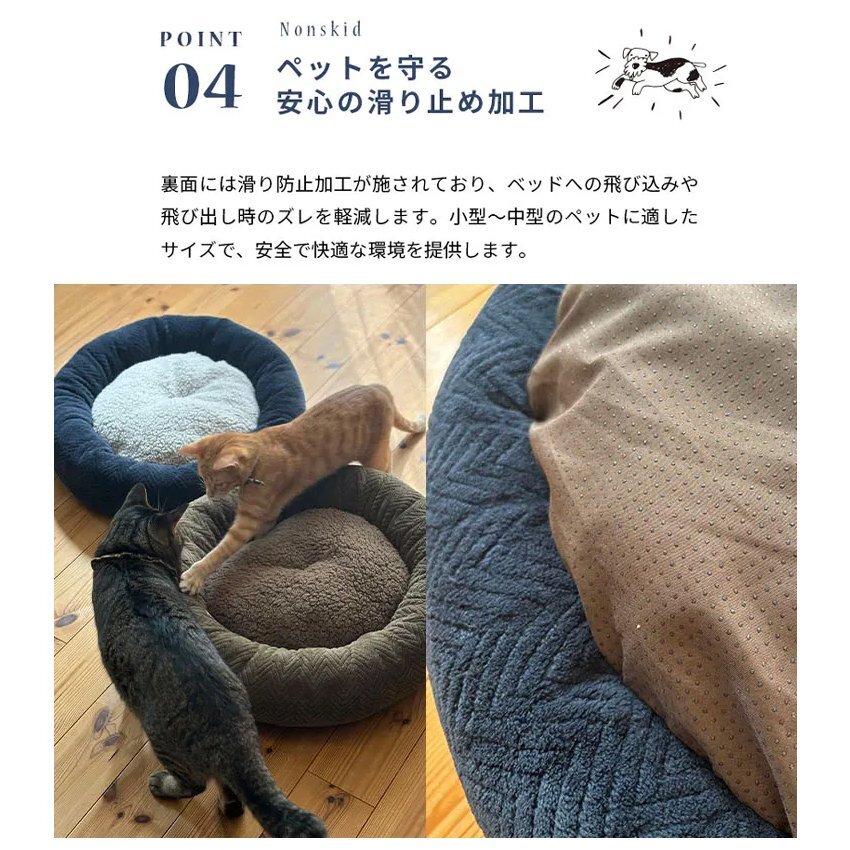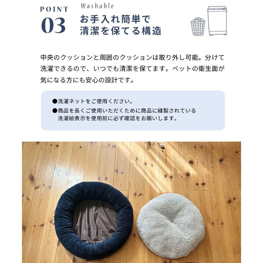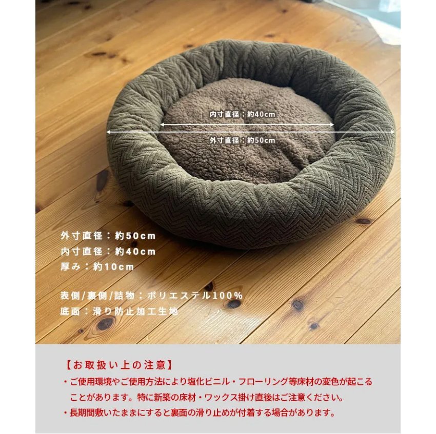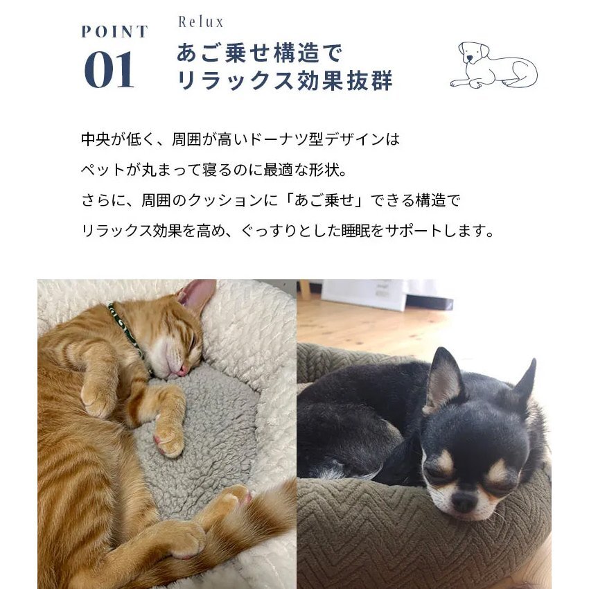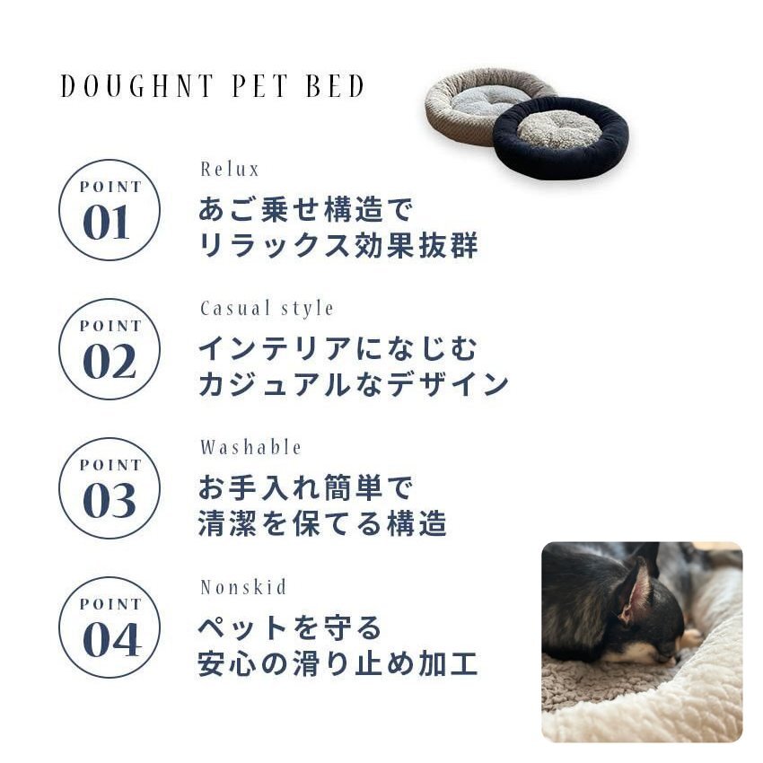 | 思わず飛び込んでしまうようなふわふわ構造のドーナツ型ペットベッド。リラックス効果を高める安心の形と肌ざわりで、愛犬・愛猫の“ぐっすり”を叶えます。 全5色のデザインで、お部屋にも自然にフィット。 使うたび、ペットとの暮らしがもっと心地よくなります。 中央が少し低く、周囲がふっくらと盛り上がった形状は、自然とペットが丸まって寝たくなる安心の設計。 周囲にあごを乗せられることで、眠りを深くサポートします。 落ち着いた色合いのニット柄(グレージュ・グレー・ホワイト)と、落ち着きと深みのあるヘリンボーン柄(ネイビー・カーキ)の2つのデザインからお選びいただけます。 |