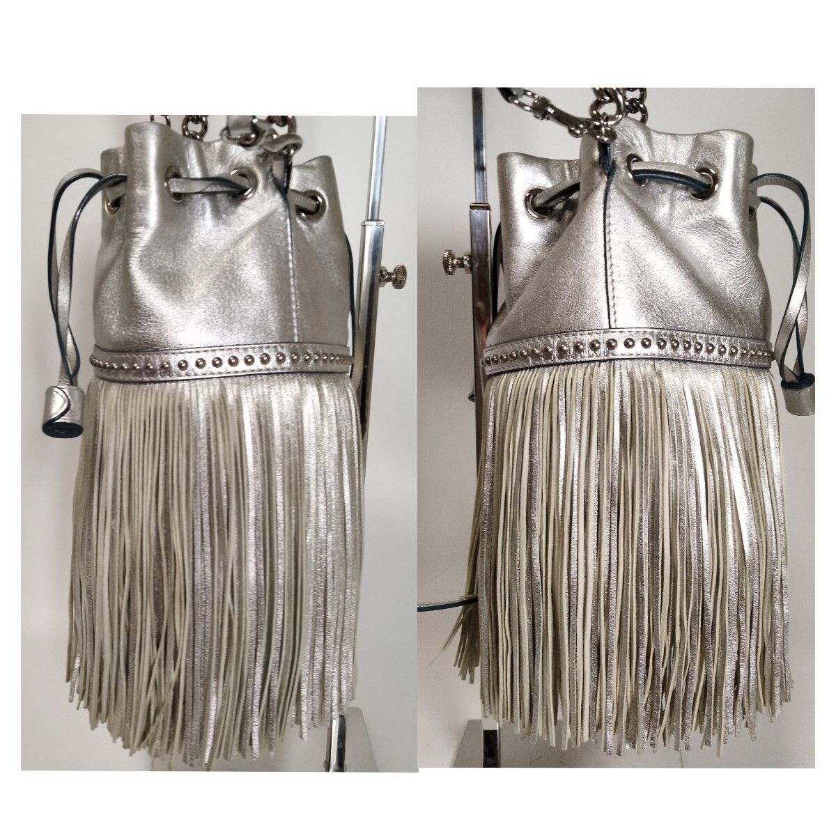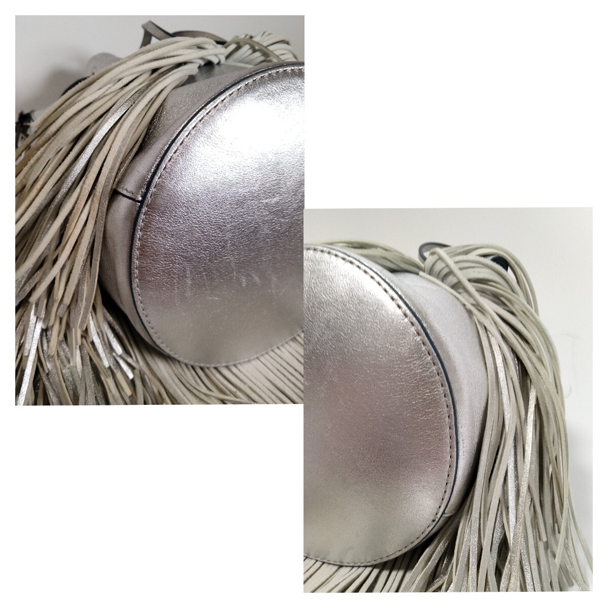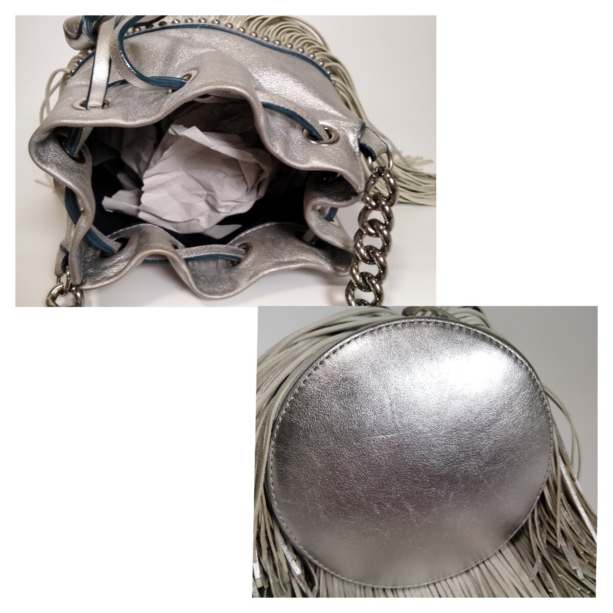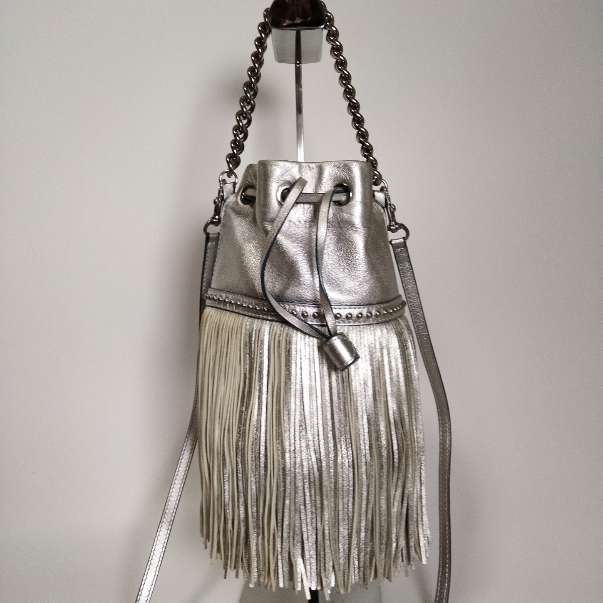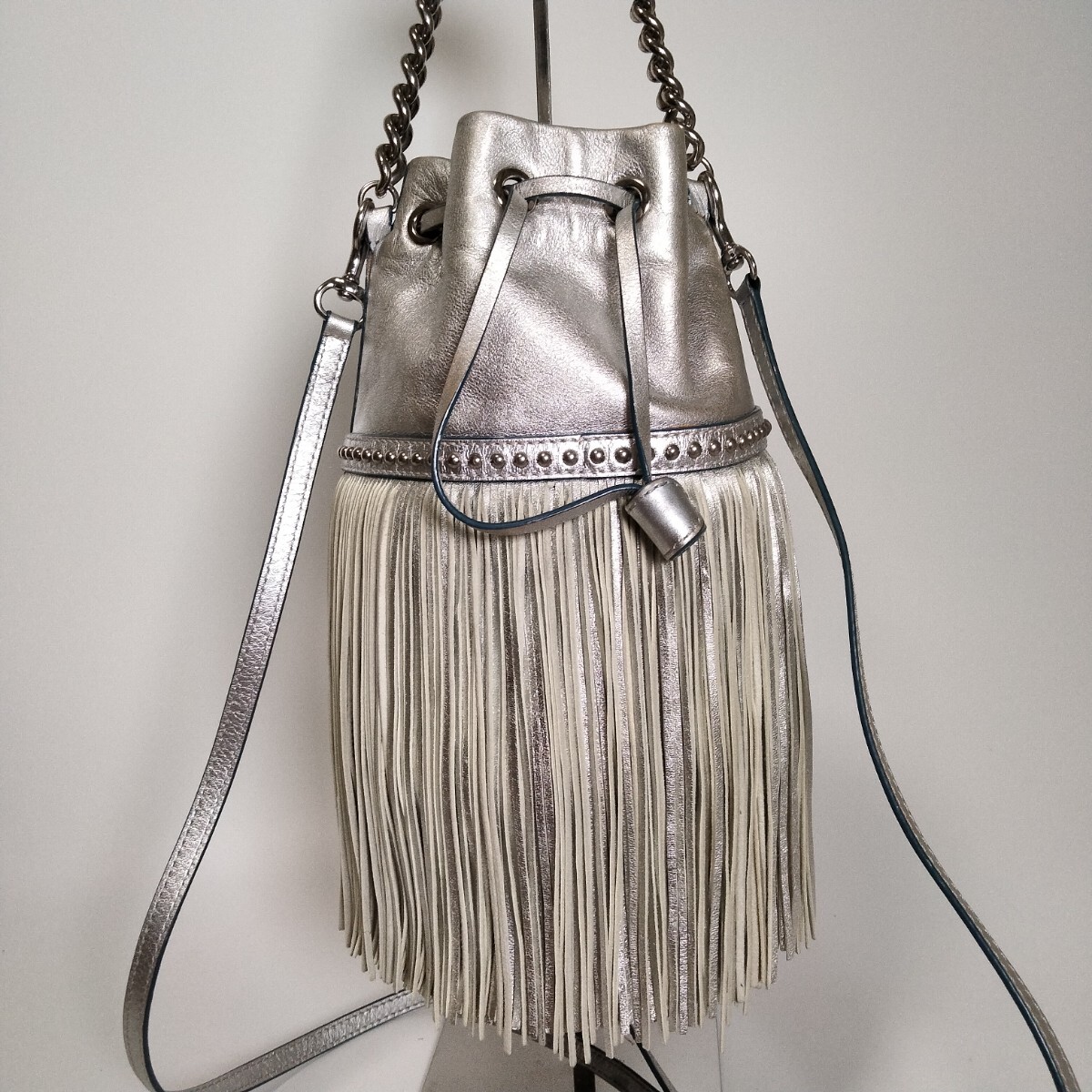 メタリックシルバーの輝きが目を引くボディに、長いフリンジがエレガントなムードを演出します。
