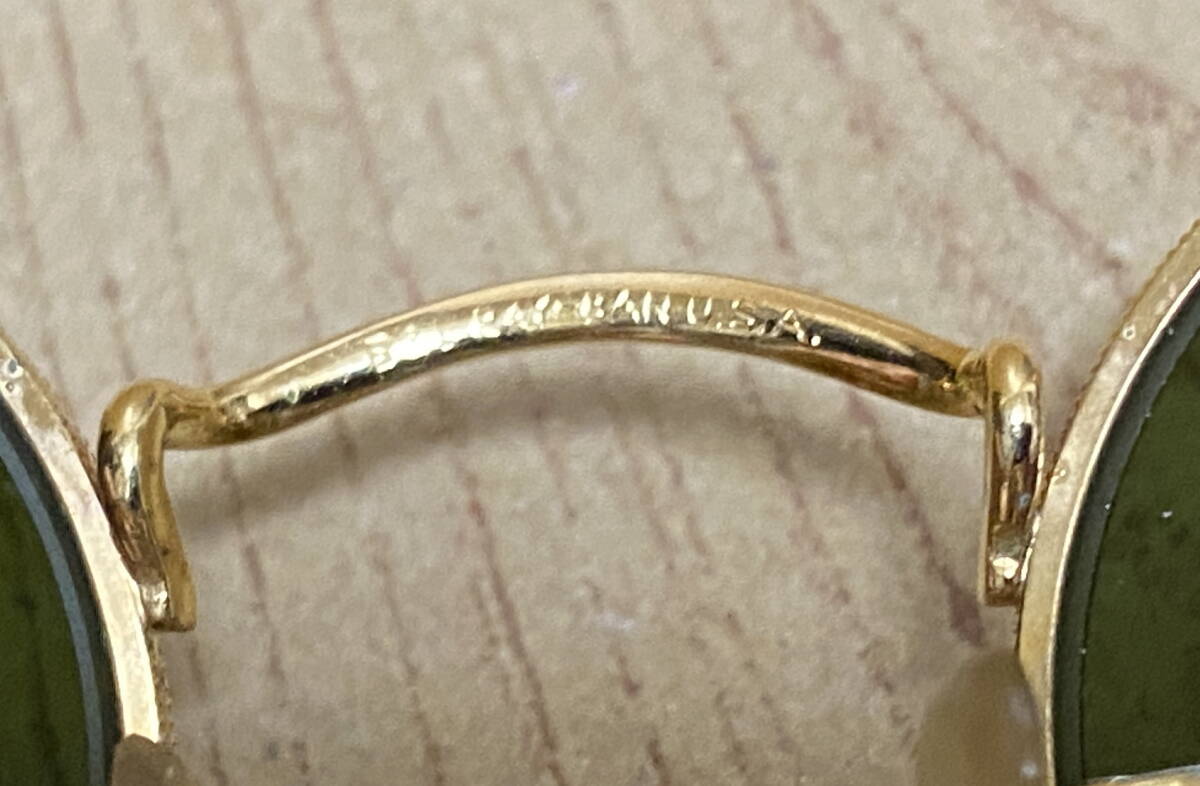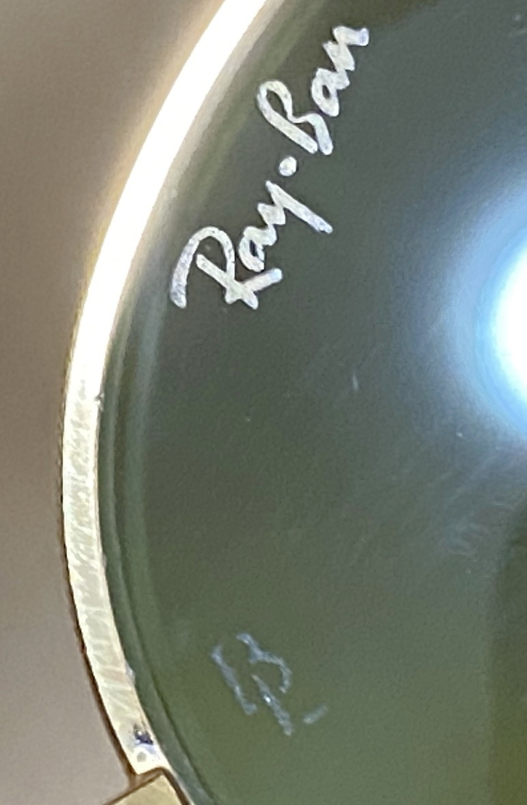 向かって左レンズ左上にゴールドのRay-Banプリントロゴ、左右レンズ左右端にBL刻印があります。