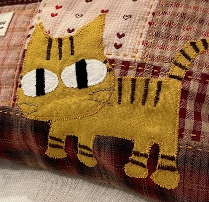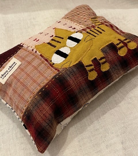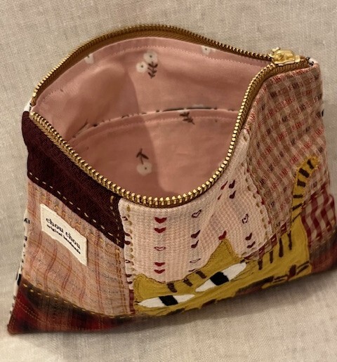 色々パッチした生地におてんばニャーコ(ネコ)をアップリケして、ファスナーポーチを作りました。