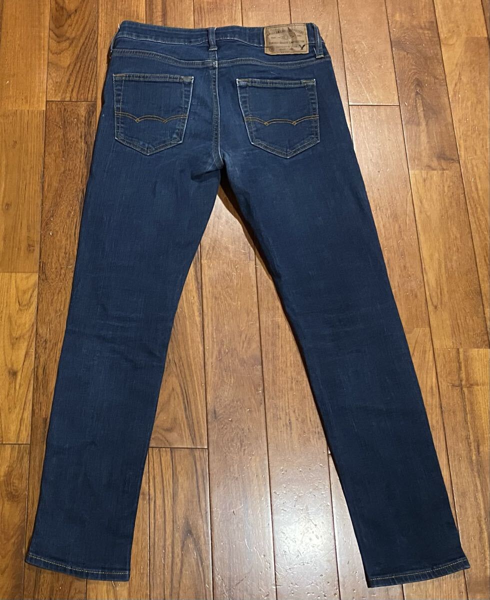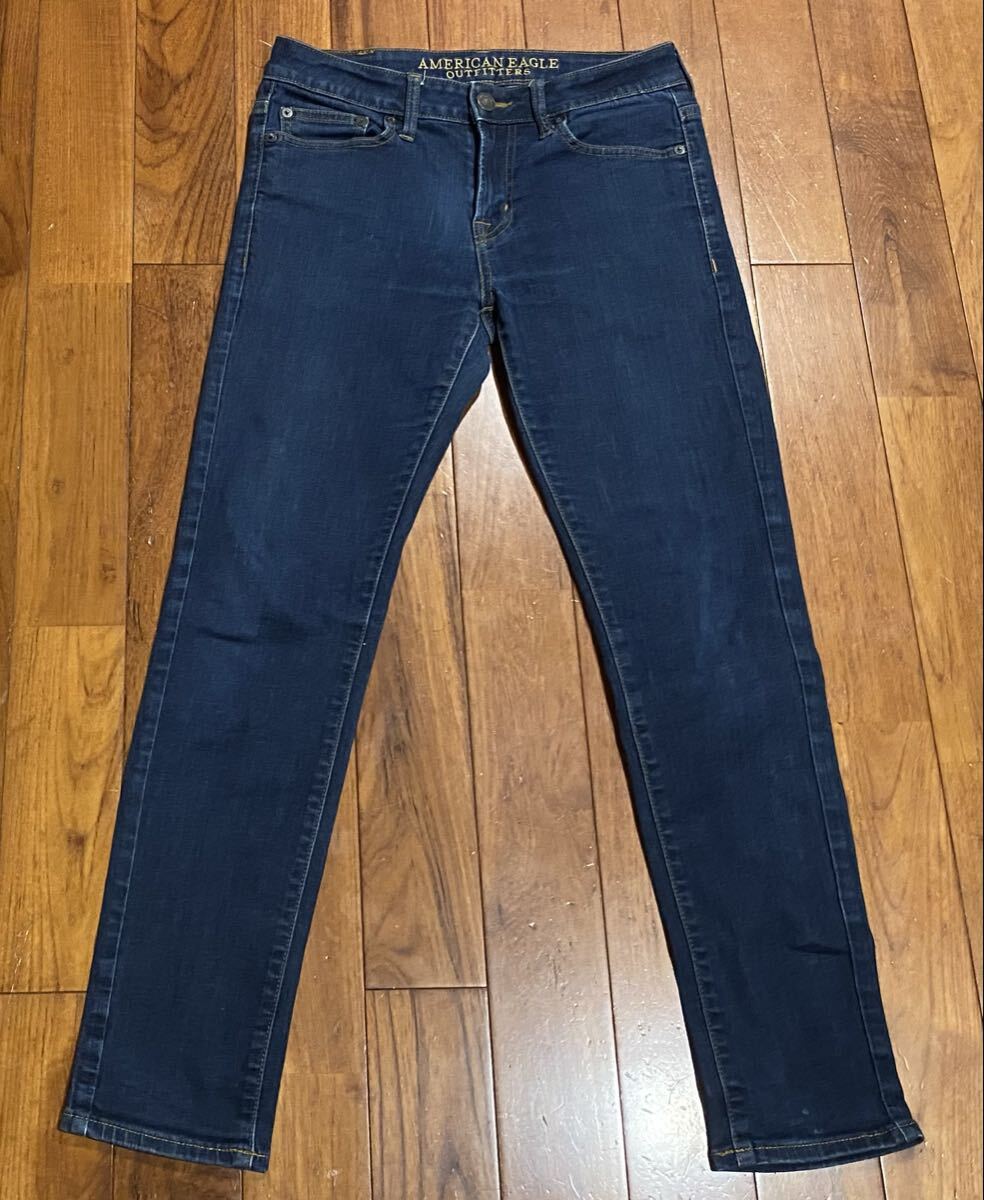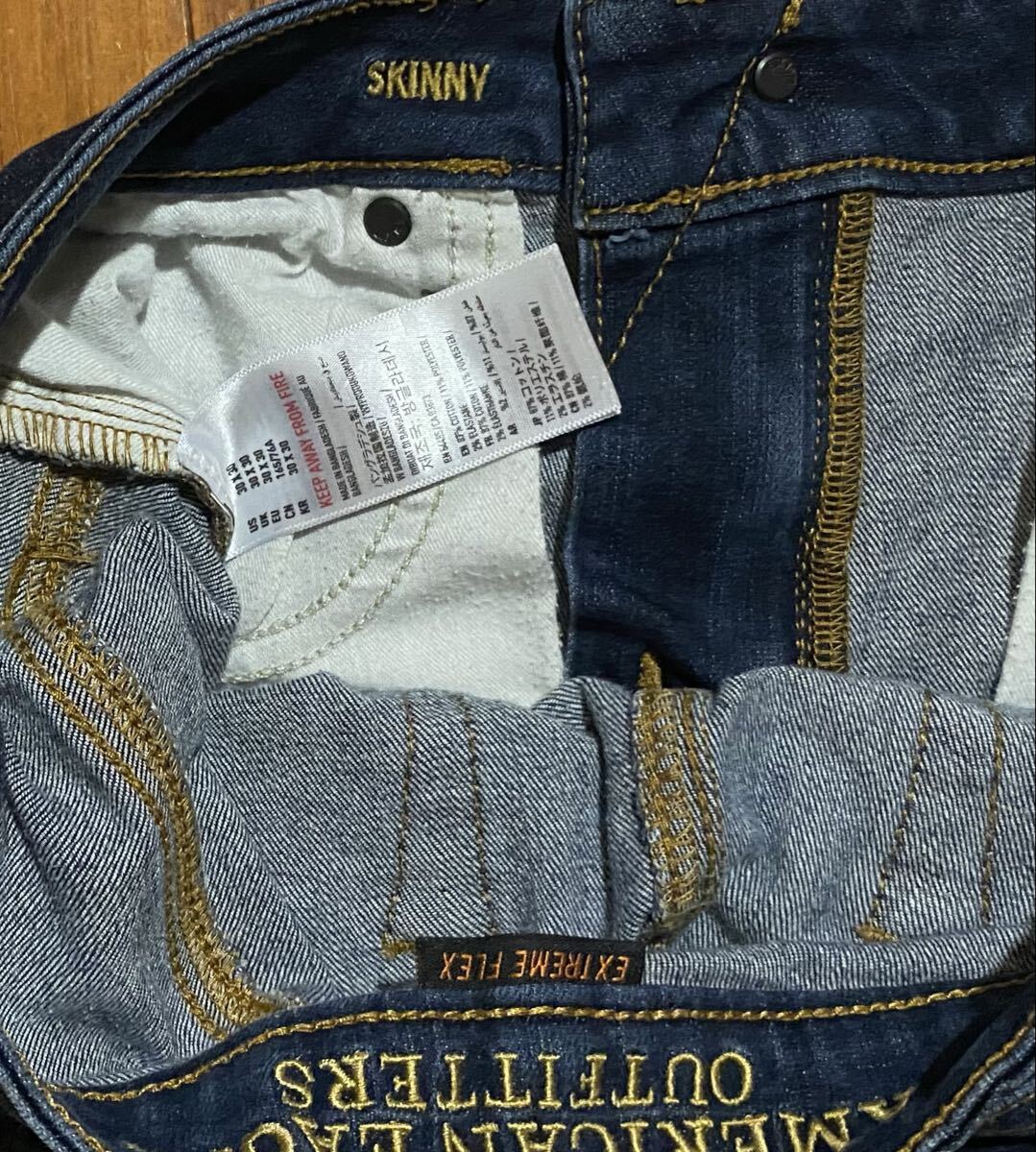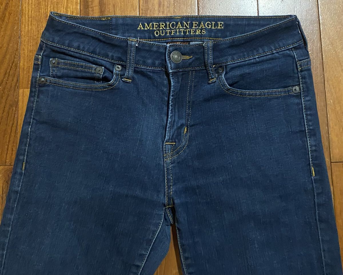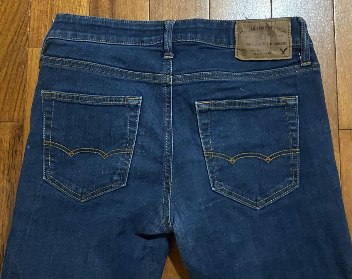 アメリカンイーグルのストレッチスキニーデニム(ジーンズ)、EXTREME FLEX SKINNYです。色はインディゴブルーです。USEDで右後ろポケット横に少し擦れありますが状態は良いです(10段階中7程度)。紙パッチ、ジッパーフライ、裾はチェーンステッチです。生地はストレッチ入りでコットン87%、ポリエステル11%、エラスチン2%です。正規品です((株)イーグルリテイリング、バングラデシュ製)。サイズはW30×L30でウエストは重ねずに平置きで約73cm、ヒップ約88cm、股上約23cm、股下約70cm、股下15cmのふともも部分約44cm、裾まわり約29cm、重量約450gです。発送はゆうパケットポストになります。