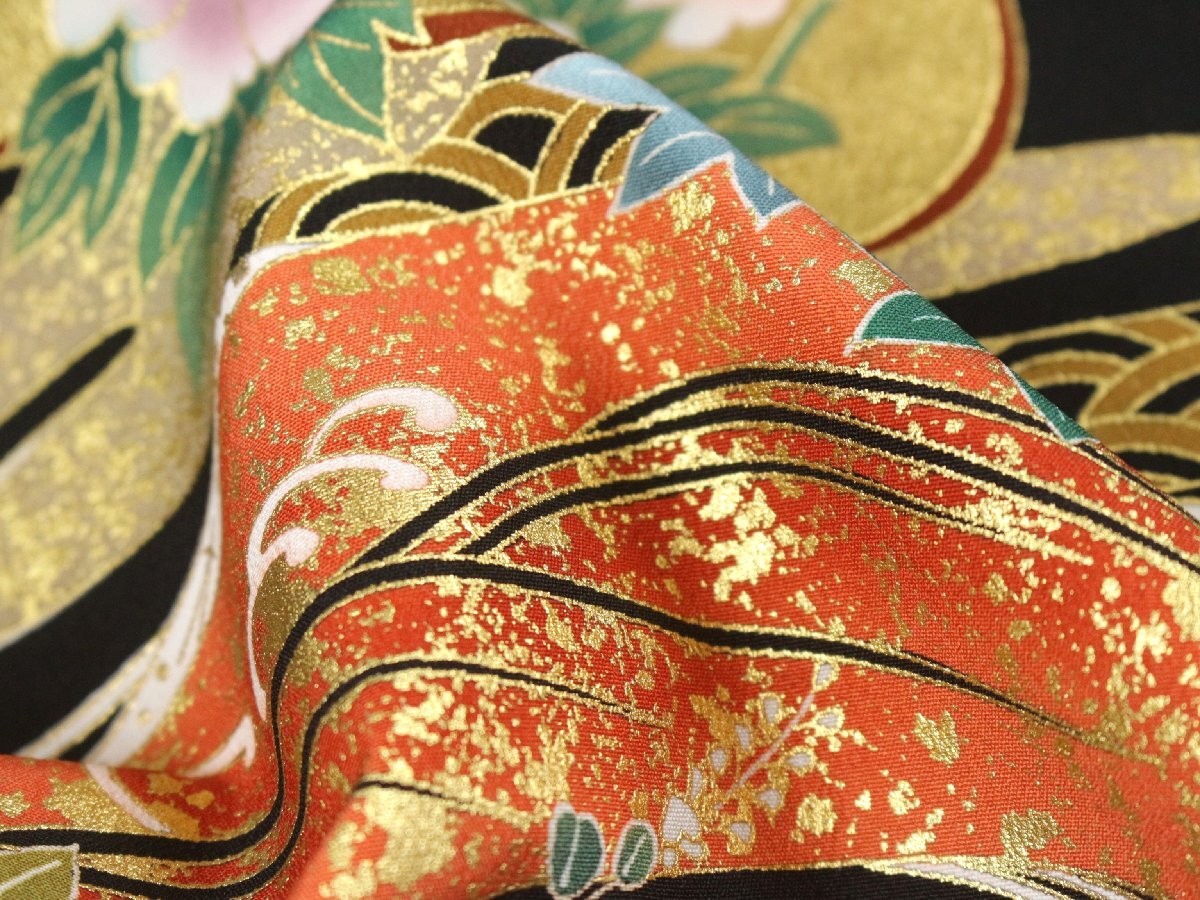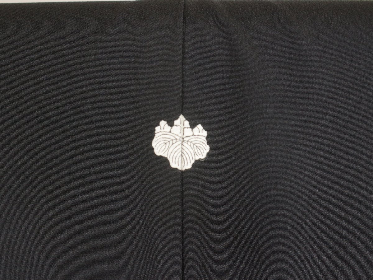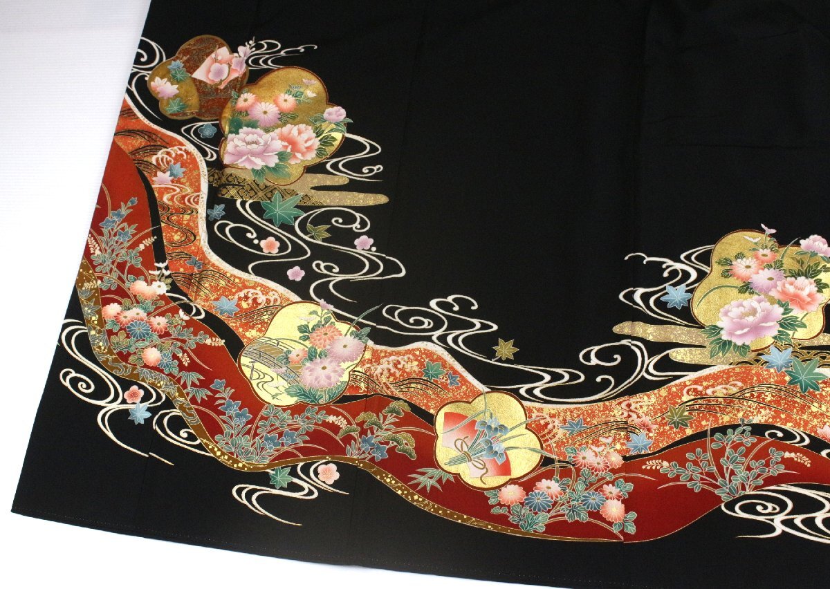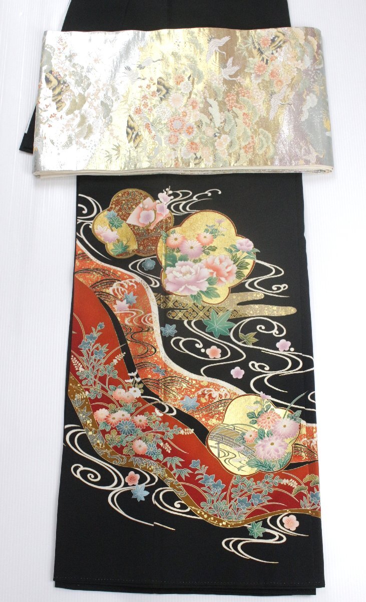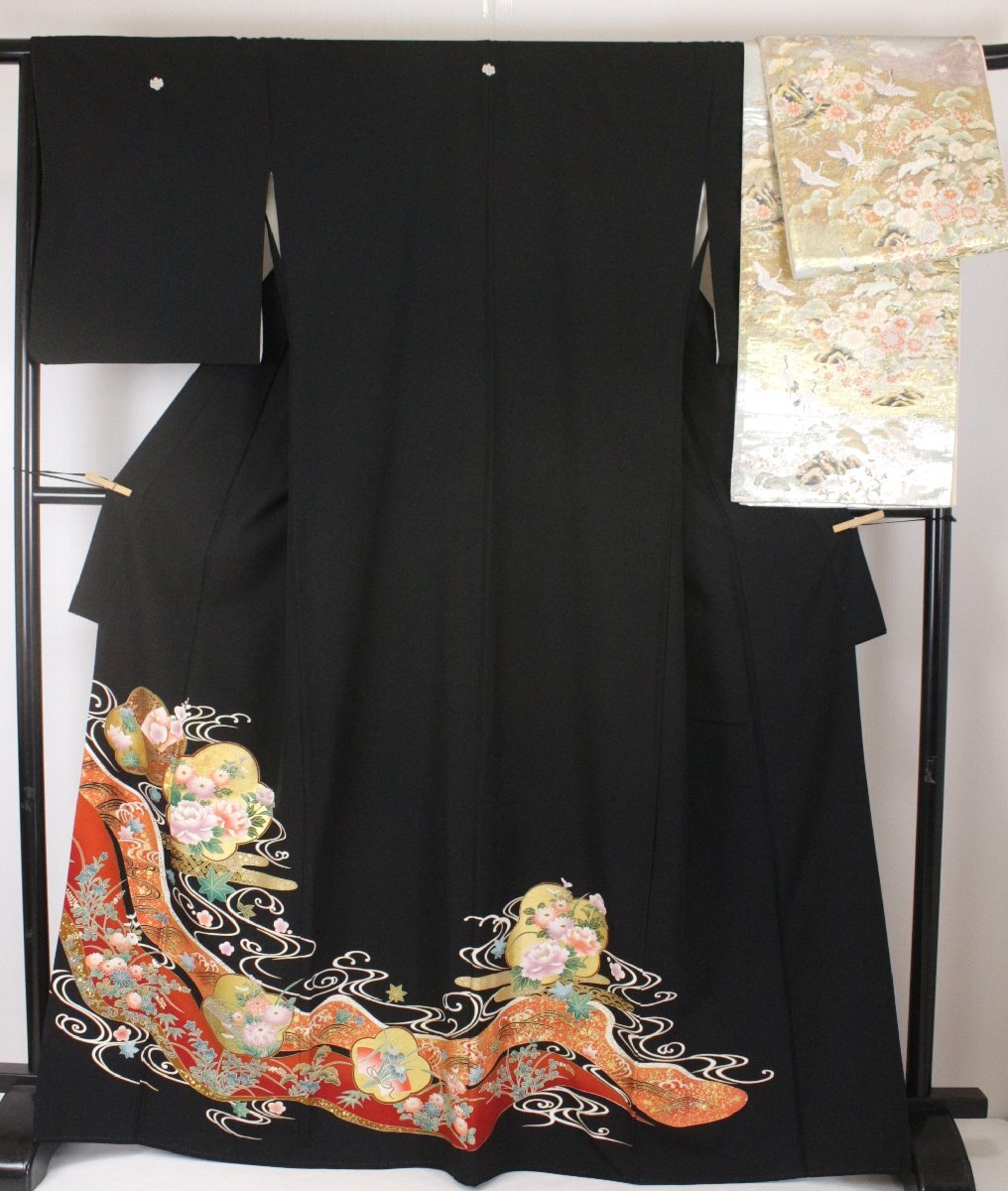 五つ紋の正絹黒留袖と袋帯セットのご紹介です。 渋朱を基調とした道長取りに、曲水に咲く梅花を金彩加工で表現。金彩の輝きが雅やかな趣を添え、四季を寿ぐ吉祥の意匠として格式と華やかさを兼ね備えています。 袋帯は「万華秀鳳文様」。吉祥の象徴である鳳凰を中心に、万華のように広がる華麗な意匠が織り出され、格調高い留袖の装いをより一層引き立てます。 慶びの場にふさわしい華やぎと品格を備え、結婚式など格式ある場にふさわしい、晴れの日を彩る上質な一式として、ぜひお役立てください。 ※撮影時の部屋の照明によって画像の色に若干の差がございます。色味に差がございますことをご了承のうえご検討下さいませ。 …状態… 着物:衿内側にシミ。胴裏に若干の黄変あり。 帯:折り跡、汚れあり。 ※全くの新品ではございませんので、記載のない変色やスレ、ヤケ、その他僅かな難がある場合がございます。そのような理由でのキャンセルはお受けできませんので、ご了承の上ご検討お願いいたします。 |