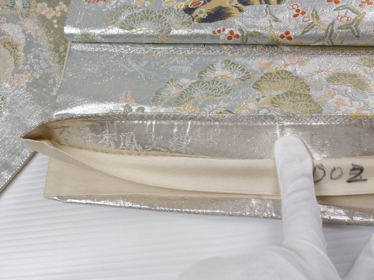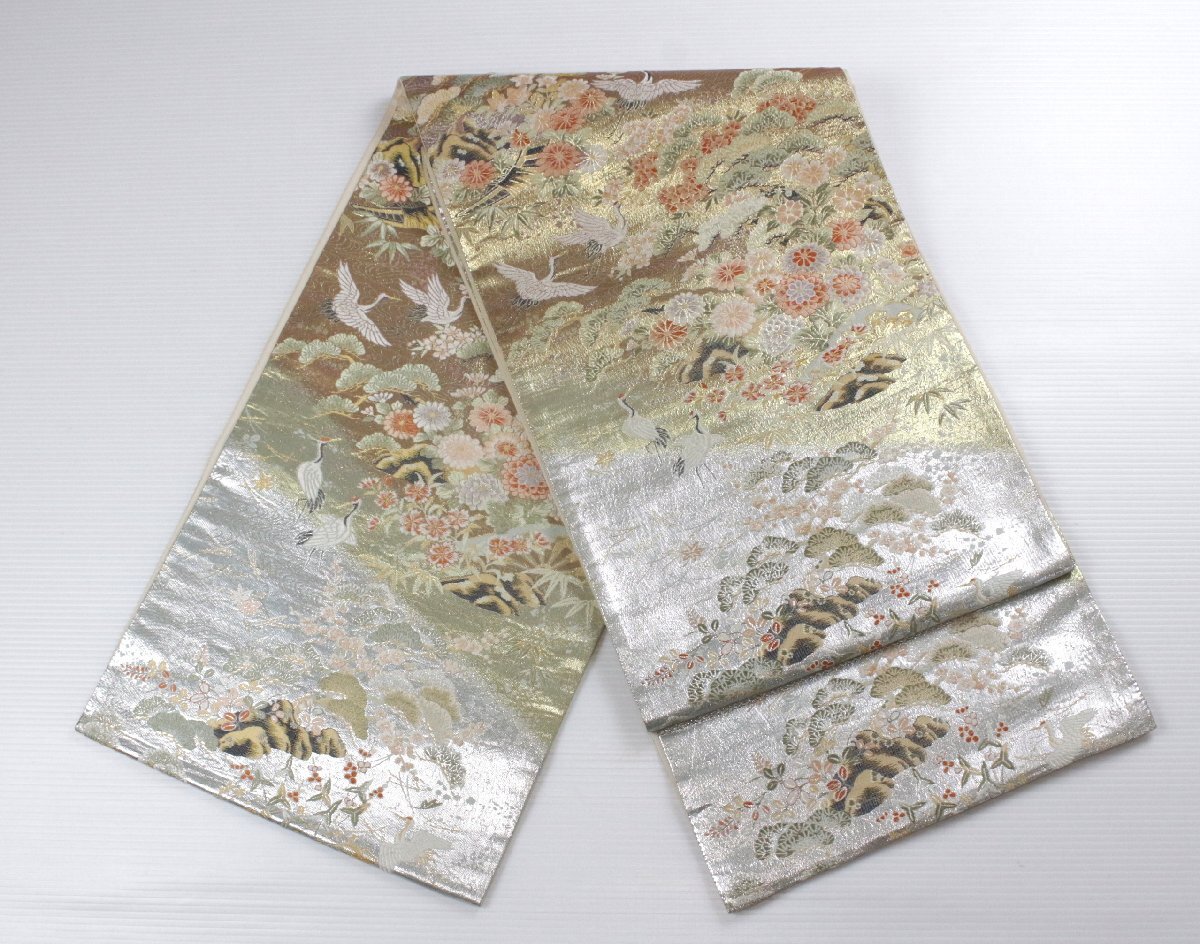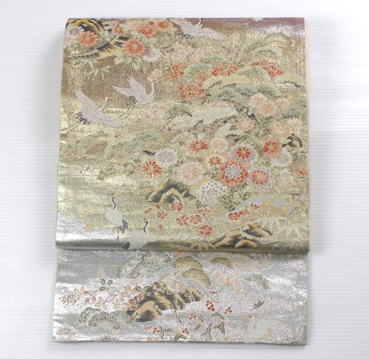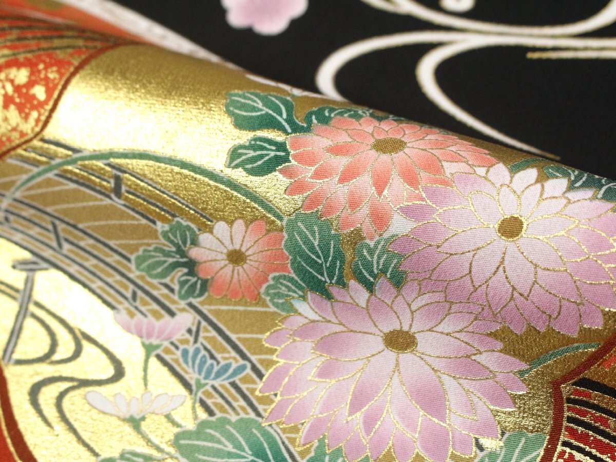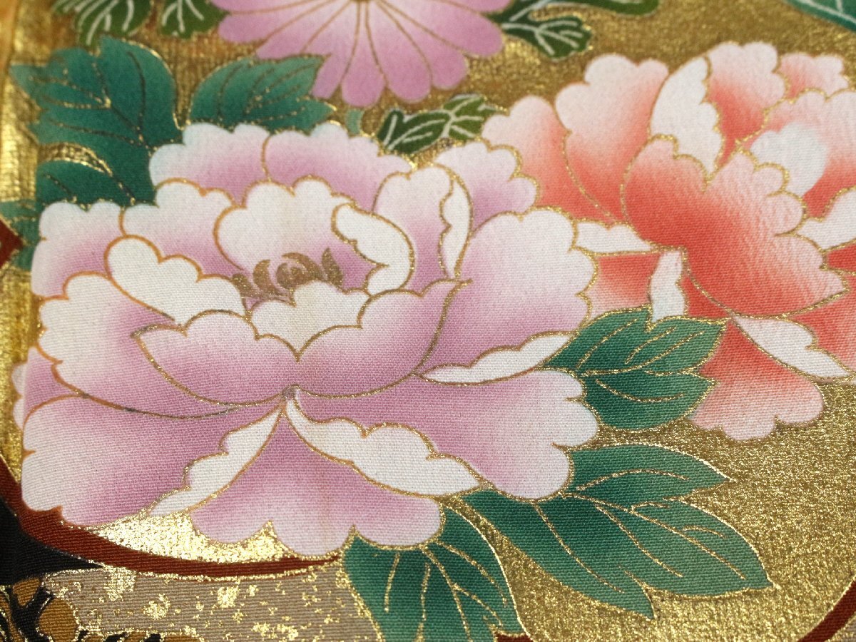 五つ紋の正絹黒留袖と袋帯セットのご紹介です。 渋朱を基調とした道長取りに、曲水に咲く梅花を金彩加工で表現。金彩の輝きが雅やかな趣を添え、四季を寿ぐ吉祥の意匠として格式と華やかさを兼ね備えています。 袋帯は「万華秀鳳文様」。吉祥の象徴である鳳凰を中心に、万華のように広がる華麗な意匠が織り出され、格調高い留袖の装いをより一層引き立てます。 慶びの場にふさわしい華やぎと品格を備え、結婚式など格式ある場にふさわしい、晴れの日を彩る上質な一式として、ぜひお役立てください。 ※撮影時の部屋の照明によって画像の色に若干の差がございます。色味に差がございますことをご了承のうえご検討下さいませ。 …状態… 着物:衿内側にシミ。胴裏に若干の黄変あり。 帯:折り跡、汚れあり。 ※全くの新品ではございませんので、記載のない変色やスレ、ヤケ、その他僅かな難がある場合がございます。そのような理由でのキャンセルはお受けできませんので、ご了承の上ご検討お願いいたします。 |