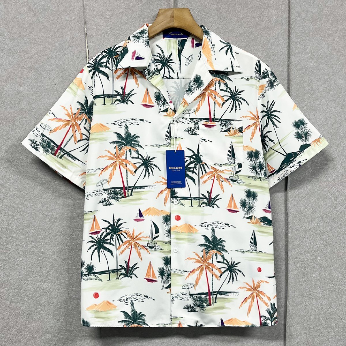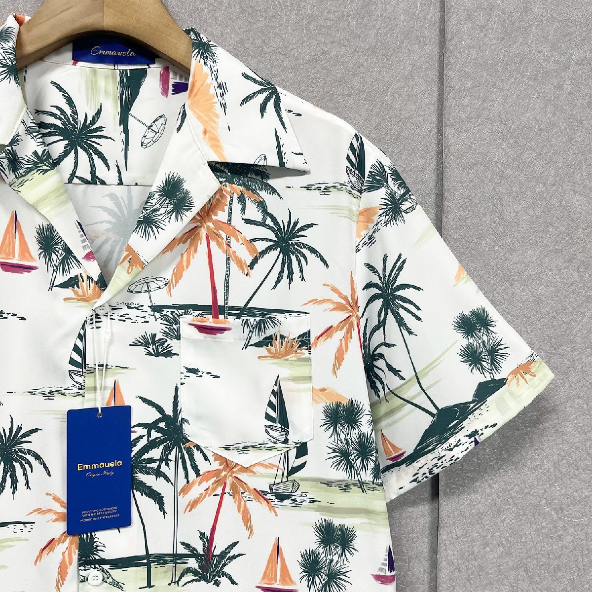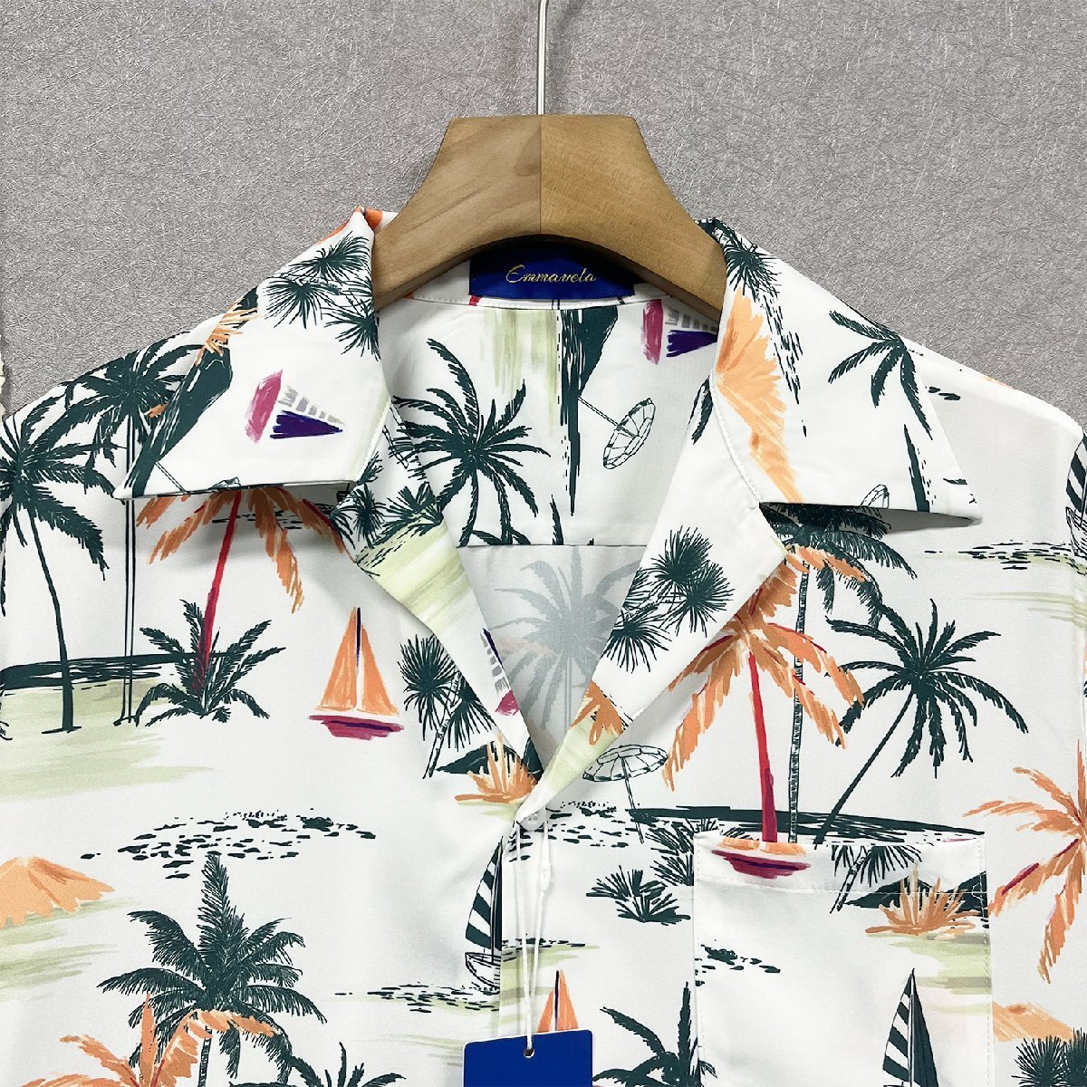 個性・アロハシャツ 定価3万◆Emmauela・イタリア・ミラノ発◆シルク混 速乾 涼しい 総柄 パームツリー柄 開襟 ハワイアン 旅行 ビーチ L/48サイズ