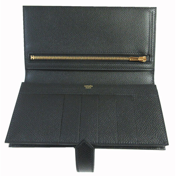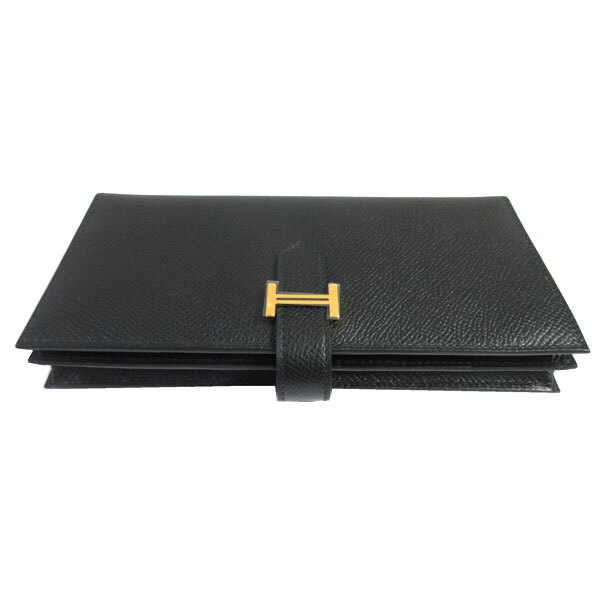 | 新品。箱・リボンでのラッピング。HERMES人気のベアンスフレは上品で素敵♪大人っぽいブラック×ゴールド金具。お札がたっぷり収容できるスフレタイプです。 |