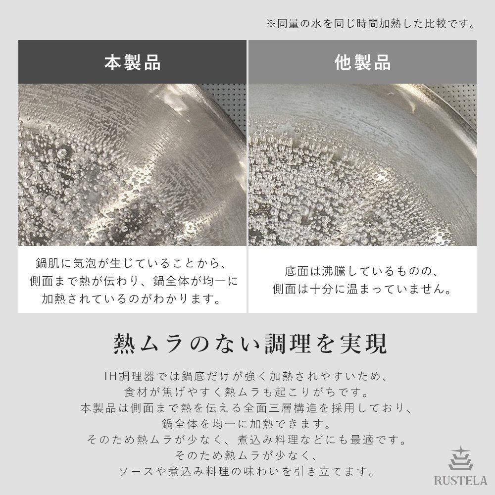 特長 | ・熱効率に優れた三層鋼を採用しており、 まんべんなく食材に火が通り調理時間の短縮に貢献。 ・直火、電磁調理器、エンクロヒーター、シーズヒーター、ラジエントヒーターに対応。 ・食洗機対応。 |