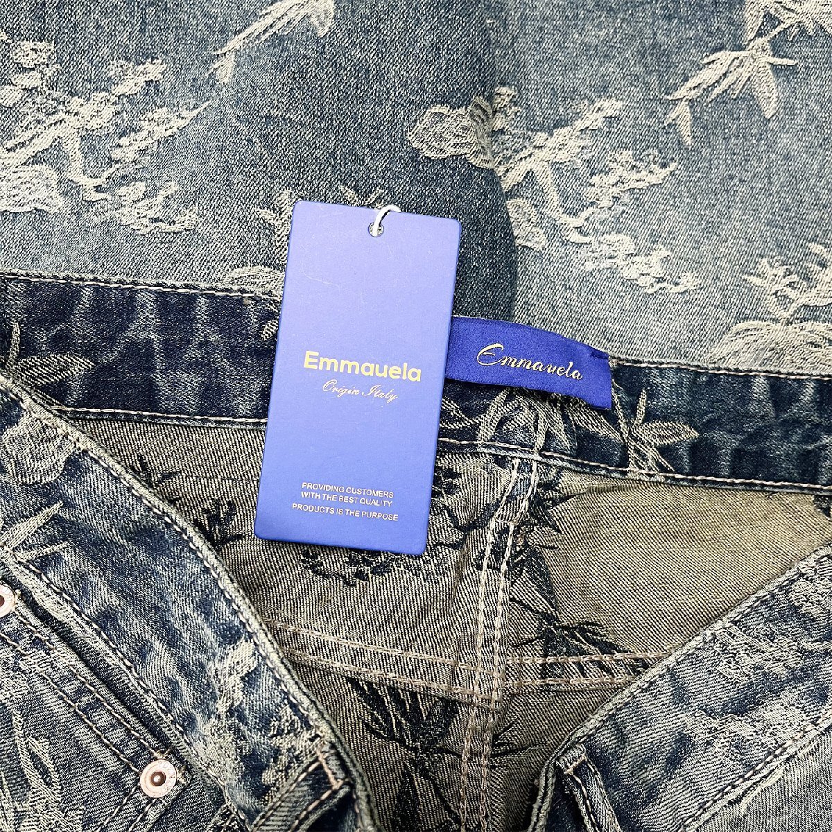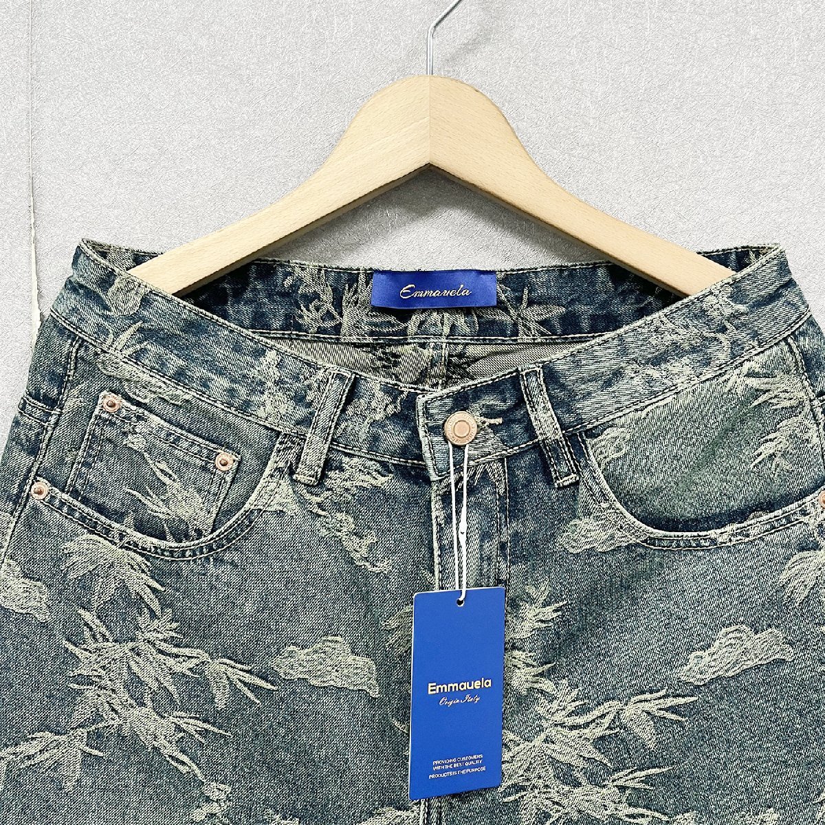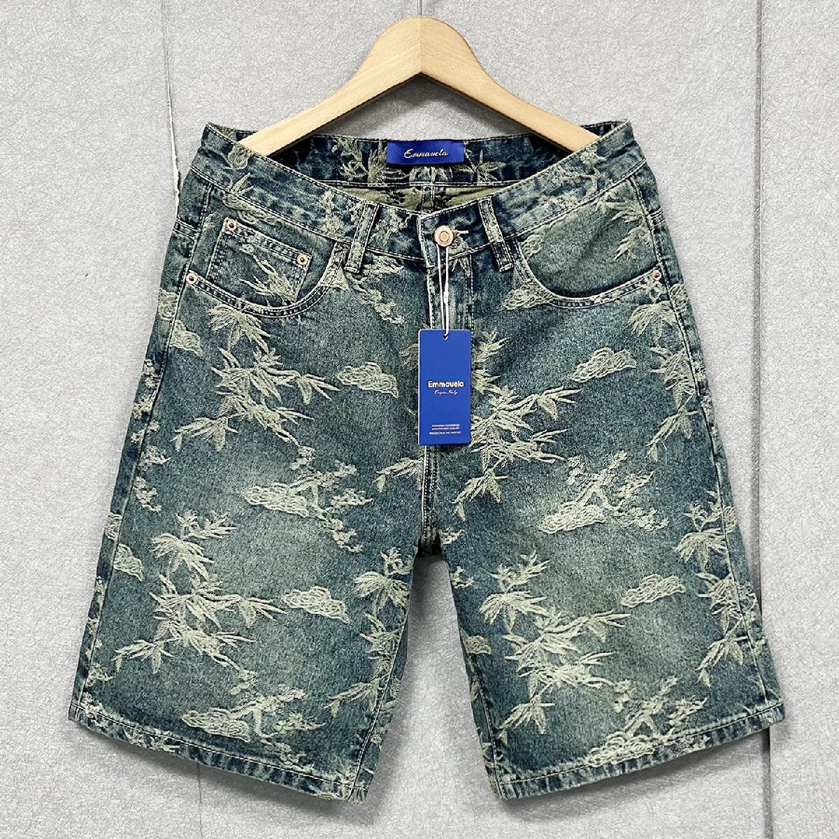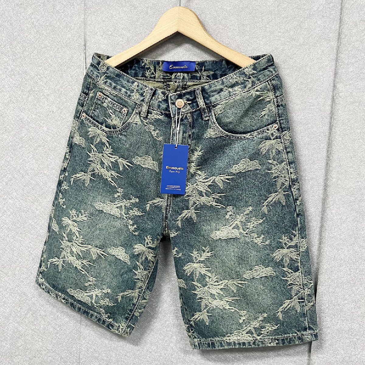 上級・ショートパンツ 定価3万◆Emmauela・イタリア・ミラノ発◆上品 快適 総柄 バンブー柄 デニムパンツ ハーフパンツ 街着 夏 31サイズ