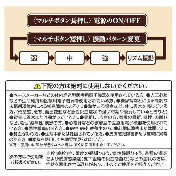 ※ 電源をオンにすると振動音がしますが、しっかり本製品を握って身体の各部位に押し当てると振動音は軽減されます。ご了承の上、ご購入をお願い致します。