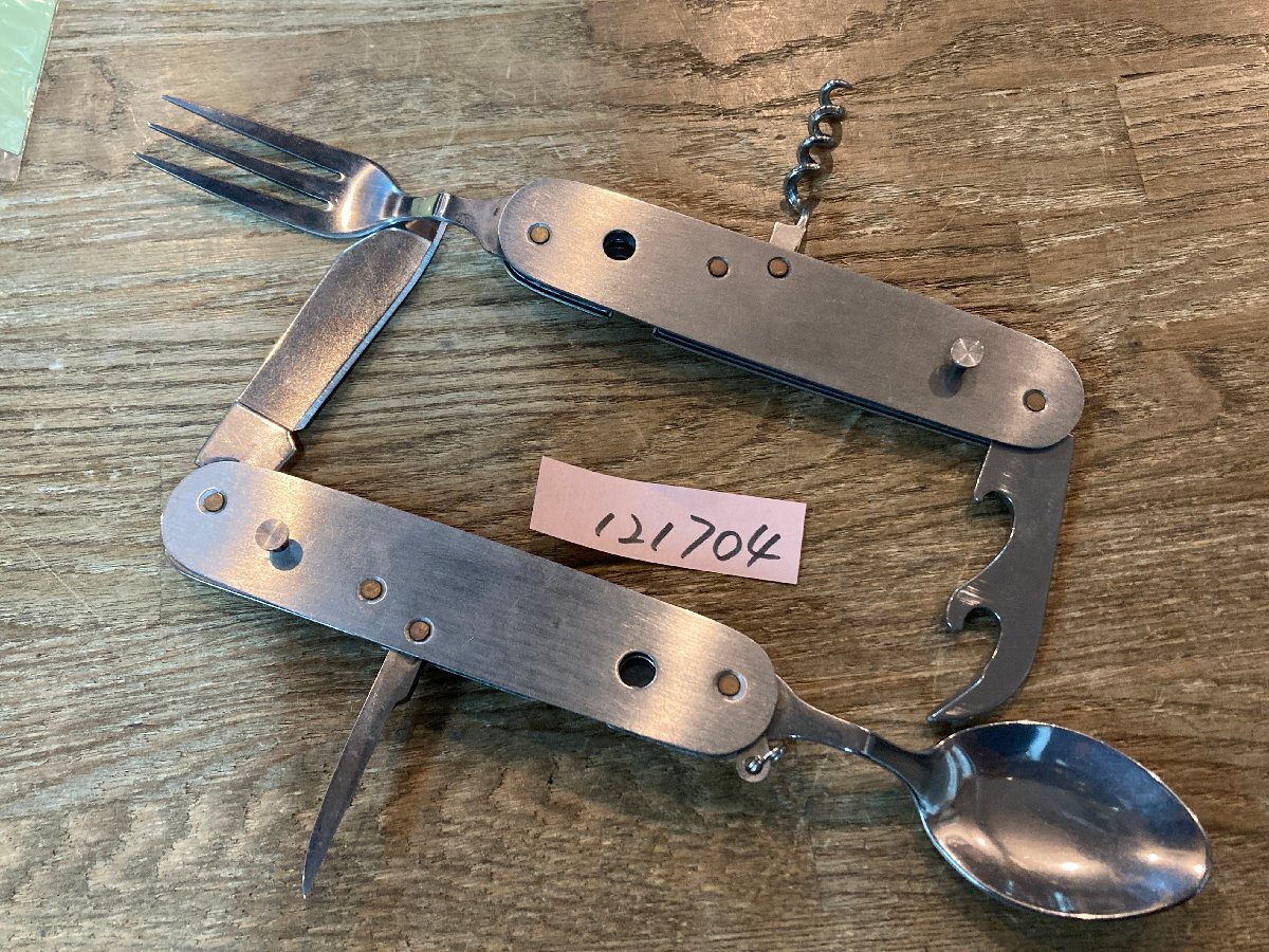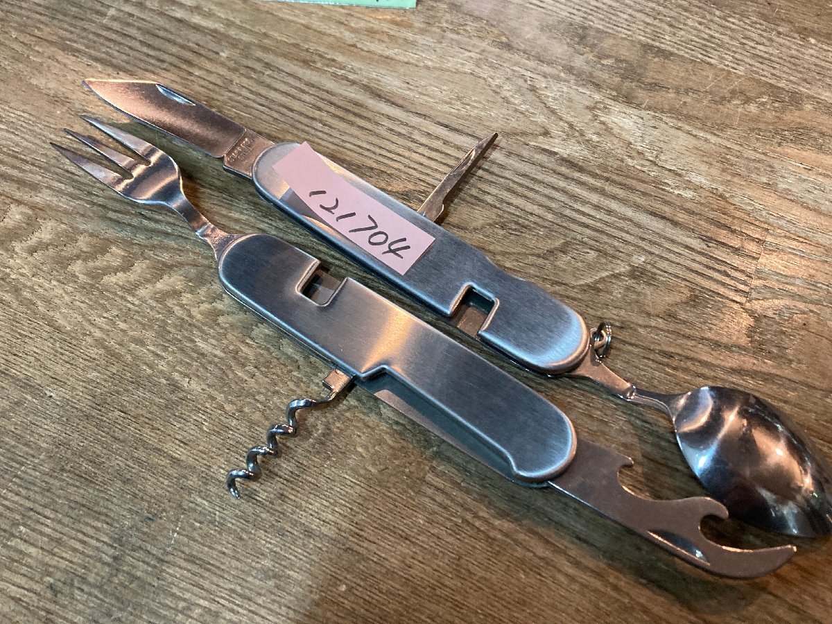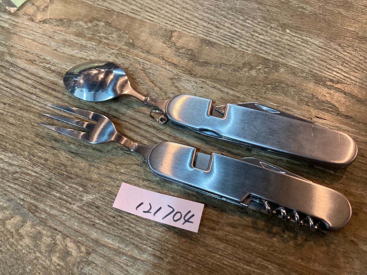 合体収納したときの寸法は11.5cmほど厚みは3cm程度です、重量は150グラム程度。スプーン・フォークを折りたたむとロックがかかる仕組みです。当然セパレートのほうが便利です! クロネコネコポス便200円にて元払いいたします、落札価格にプラスでお願いします。その他アウトドアーグッズ
