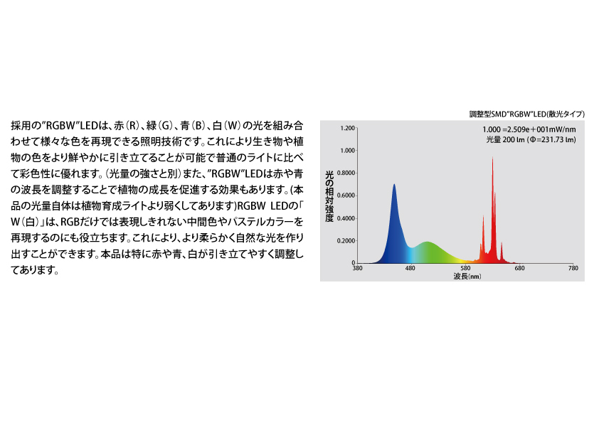 しかし光量をそれほど必要としない種に対しては適し、また逆に不要なコケの発生も抑制できる利点があり、彩色性に優れた“RGBW”LEDを採用しているため、落ち着いた雰囲気の鑑賞などにもおすすめです。