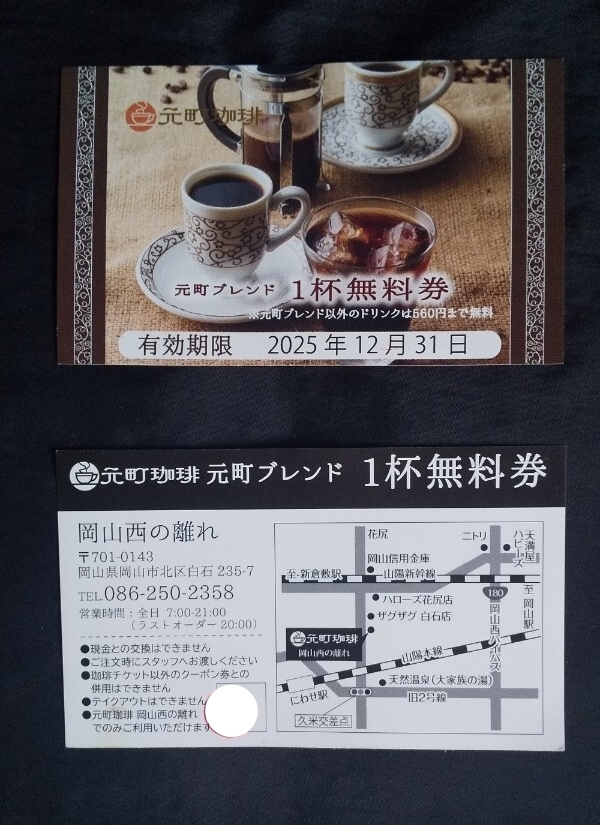 こちらの商品は岡山西の離れ店でのみ使える【店舗限定】元町珈琲 元町ブレンド1杯無料券×2枚(560円×2枚の1120円相当)です。