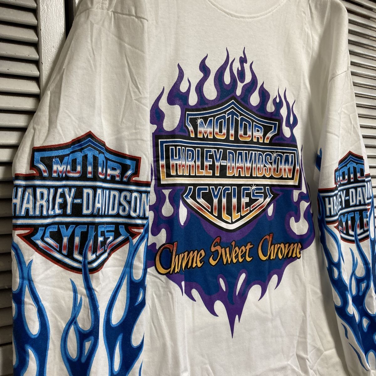 1円スタート 白 バイク Tシャツ 長袖 ロンT ハーレーダビットソン ロゴ HARLEY DAVIDSON フレイム ファイア 古着 卸 仕入れ(1)