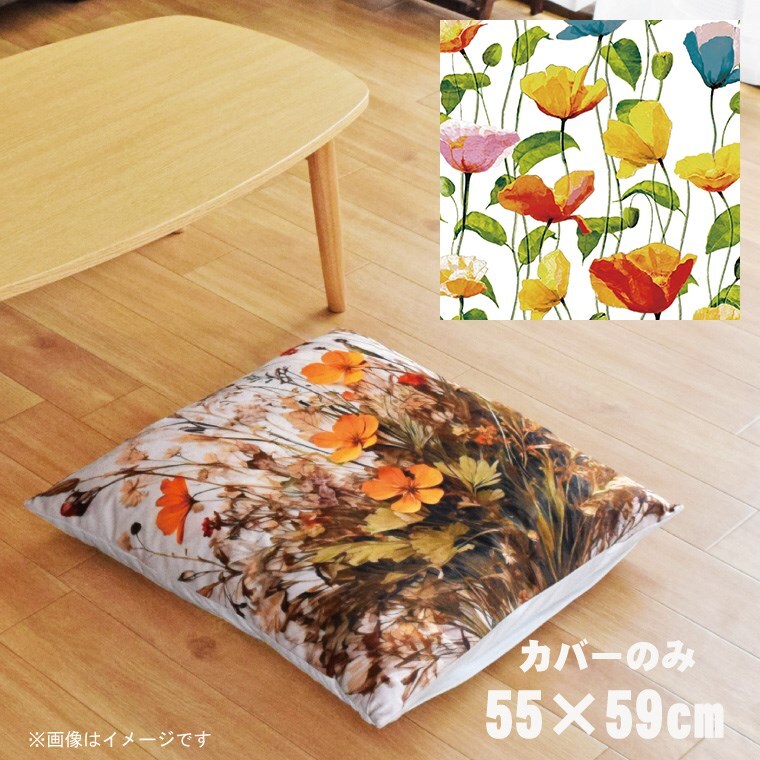 座布団 座布団カバー 約55×59cm カバーのみ 単品 洗える おしゃれ ファスナー付 リビング イラスト 転写プリント CSC-B018 ポピー