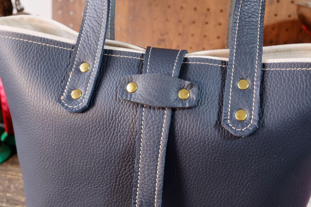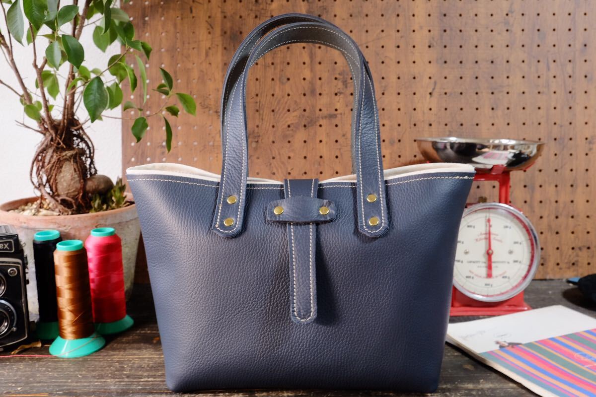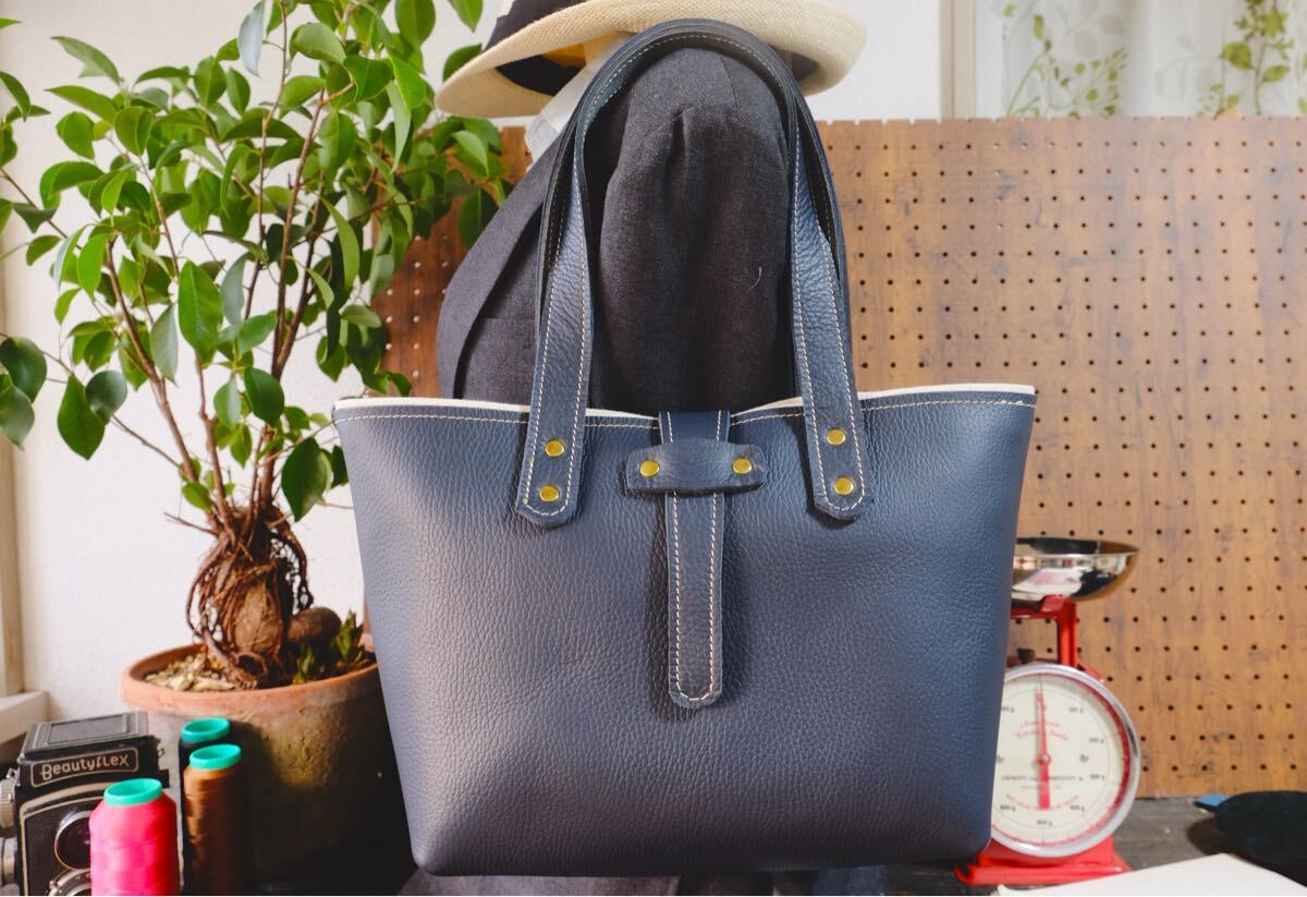 ◆◇国産スモークネイビーレザー牛革トートバッグ作家手作り★紺色日本製帆布鞄バックル紺青