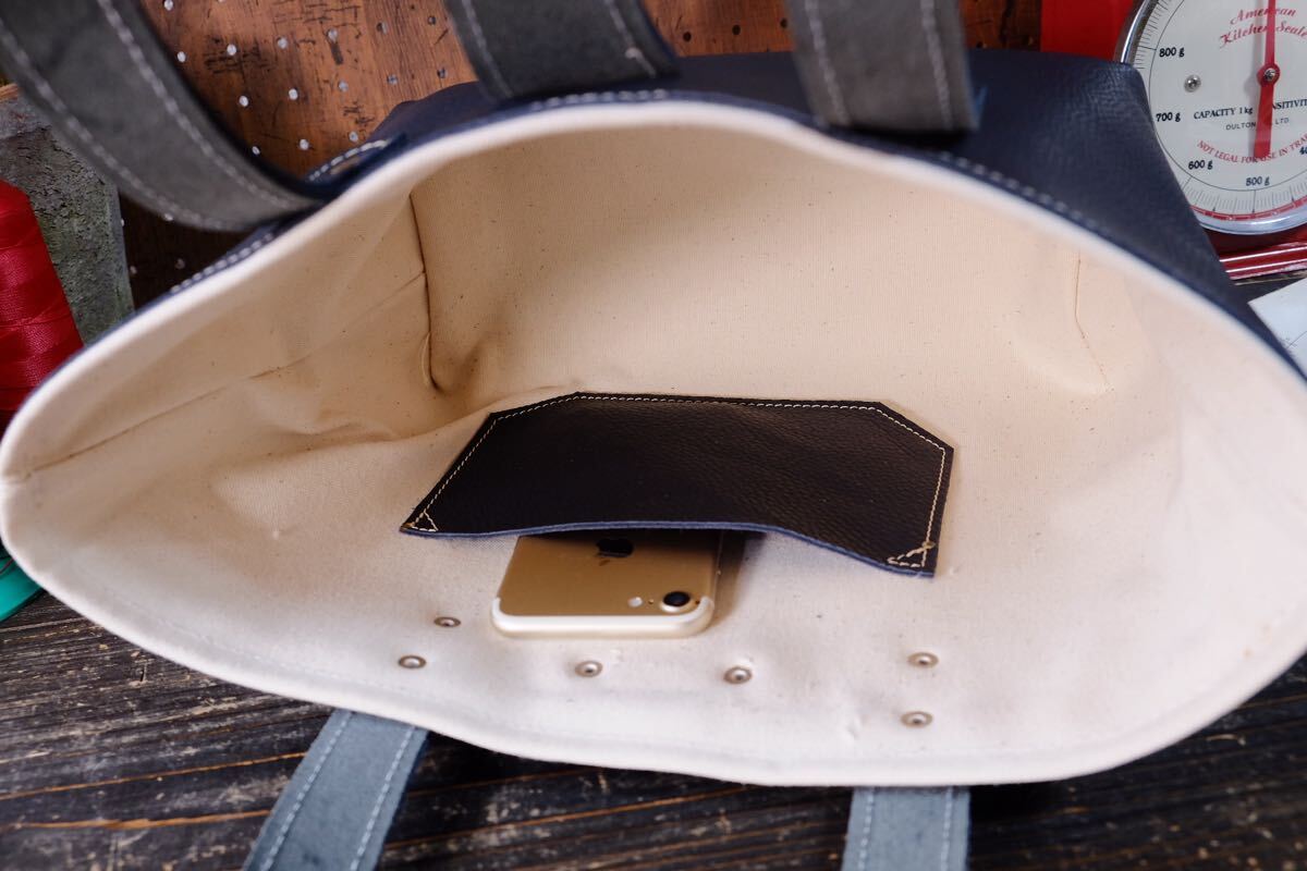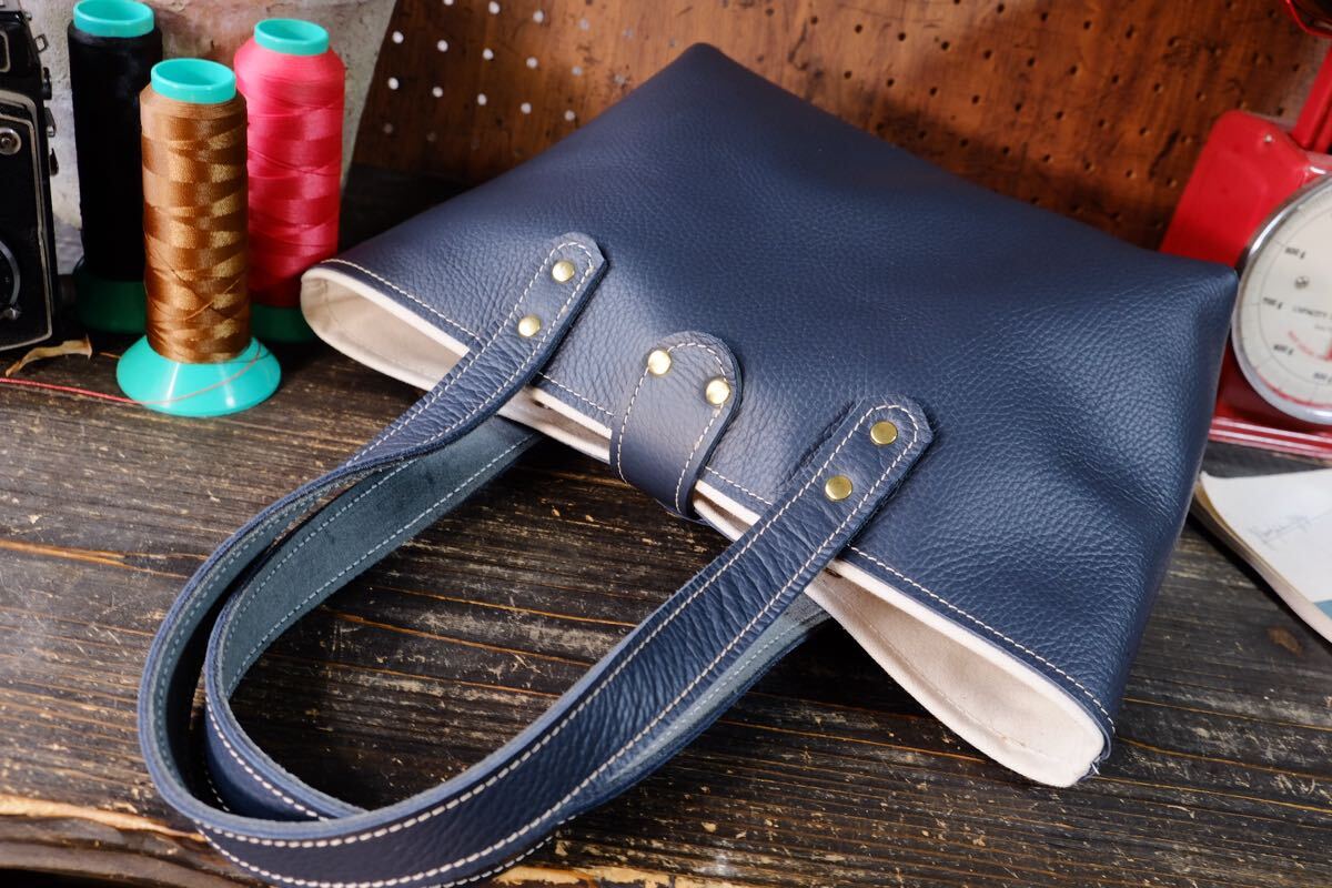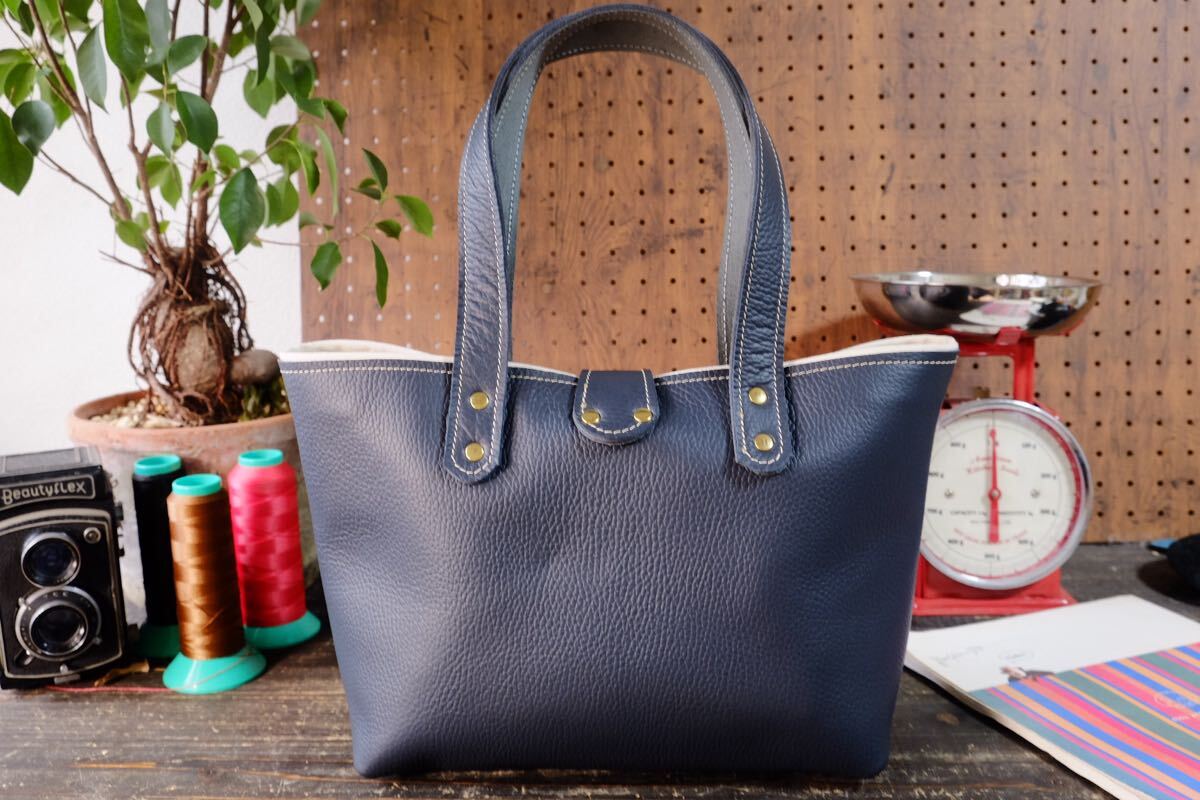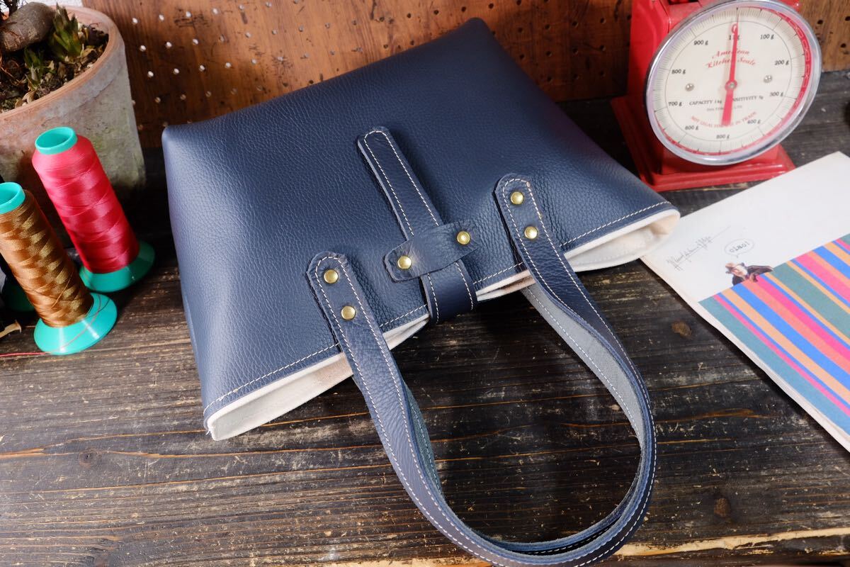 ◆◇国産スモークネイビーレザー牛革トートバッグ作家手作り★紺色日本製帆布鞄バックル紺青