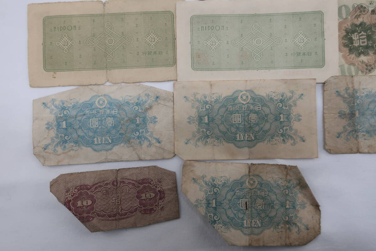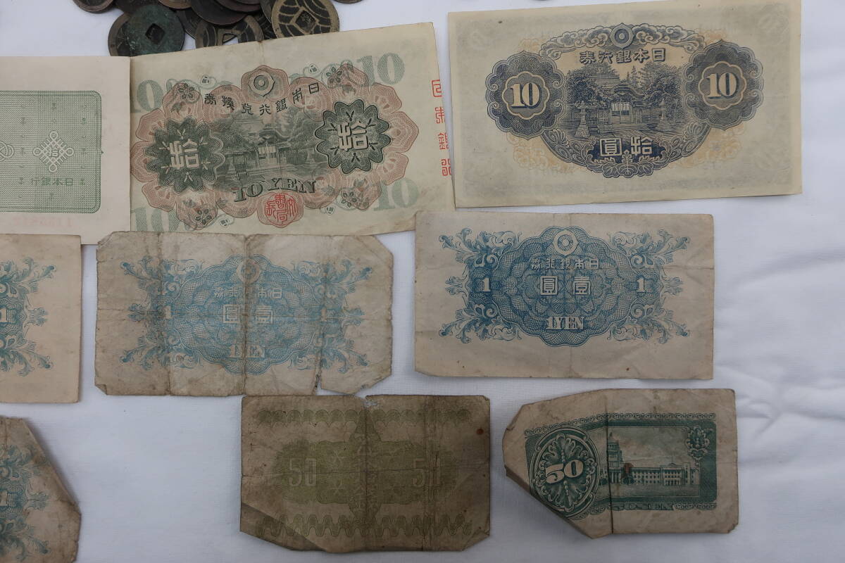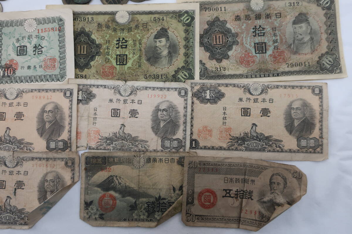 全体的に古く、紙幣は折れや擦れ、シワ等ございます。また硬貨に関しましても同様で、割れのあるもの、サビ・腐食等ございます。