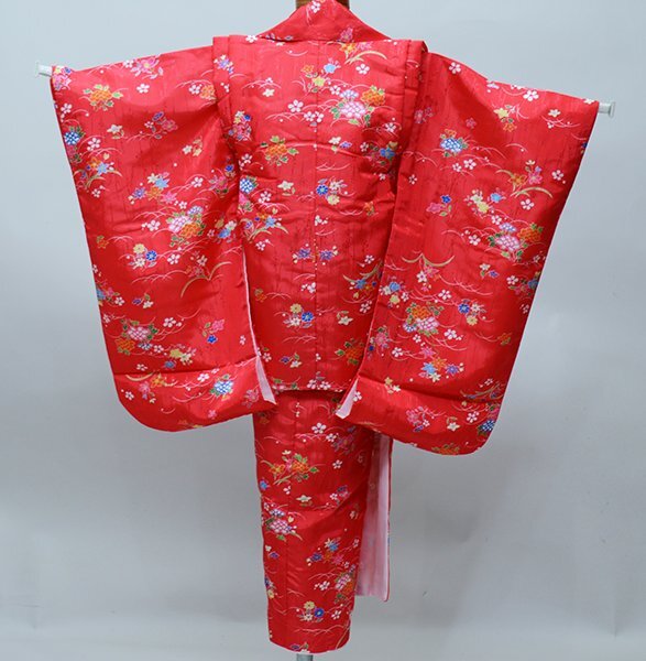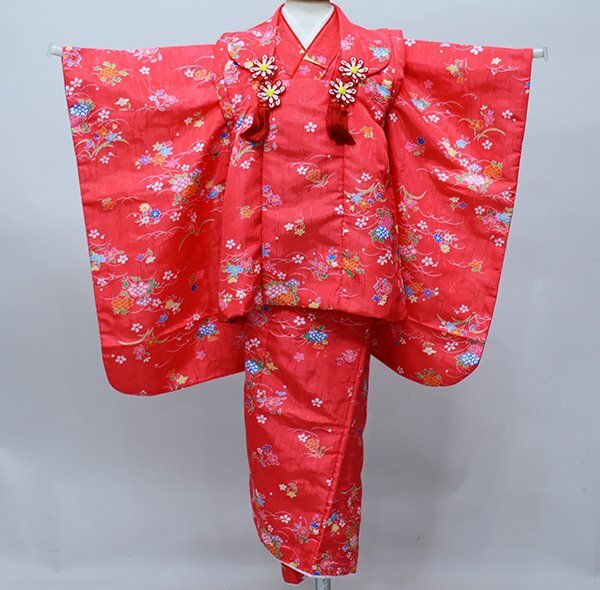 サイズ | ■着物 ・被布丈約48cm ・裄丈約40cm(3.5cmの上げ、7cmのばすことが可能) ・袖丈約57cm ・着物丈約93cm ■草履18cm(フリーサイズ) 適合身長83cm~105cm ※着丈=背中首のゴリゴリ部分から、足くるぶしまでの長さ ※裄丈=腕を斜め45度下げた状態で、背中首ゴリゴリ部分から、肩上を通して、手くるぶしまでの長さ ※身長87cm~96cmであれば特に直さずともこのままでご着用いただけるかと思います ※はじめから肩上げがとられているので解いて数センチ伸ばす(丈出し)ことも可能です。 ※腰上げはとられていないため腰ひもで着付け補正をいただければと思います。 |