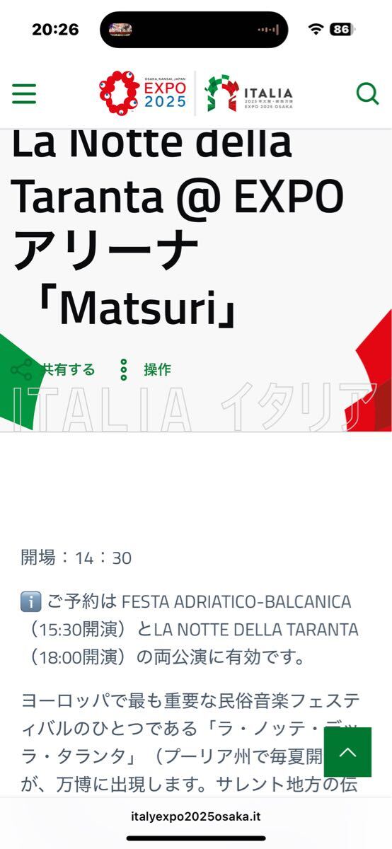 10/8 15:30 イタリア館主催イベント 2名分 大阪関西万博
