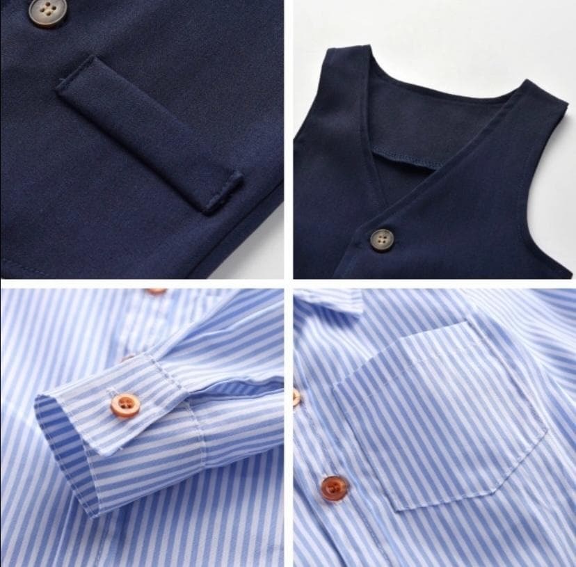 水色 の ストライプシャツ に 濃紺 のベストが オシャレ で 高級感 があります。
