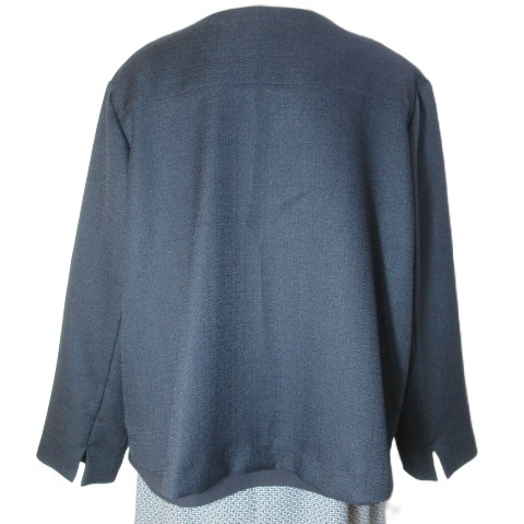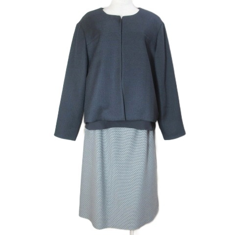 【実寸サイズ】ジャケット 肩幅:43cm ジャケット 身幅:54cm ジャケット 袖丈:53.5cm ジャケット 着丈:56cm スカート ウエスト:72-84cm スカート ヒップ:100cm スカート丈:59cm (ブラウス) 肩幅 37.5cm 身幅 50cm 袖丈 40cm 着丈 55cm