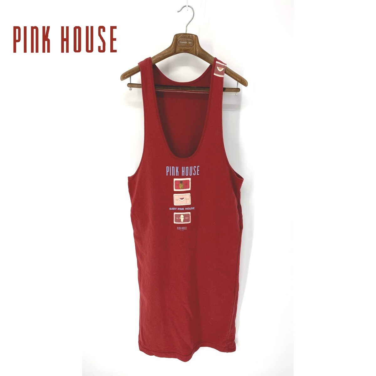 A5991/美品 春夏 薄手 PINK HOUSE ピンクハウス コットン ノースリーブ ワッペン ロング ワンピース 38程 赤/レディース カネコイサオ