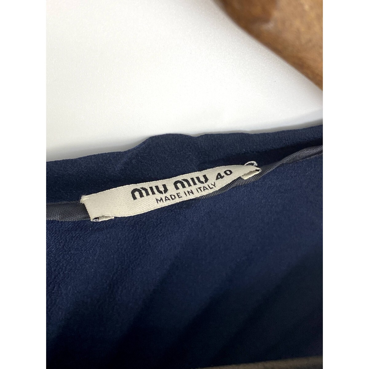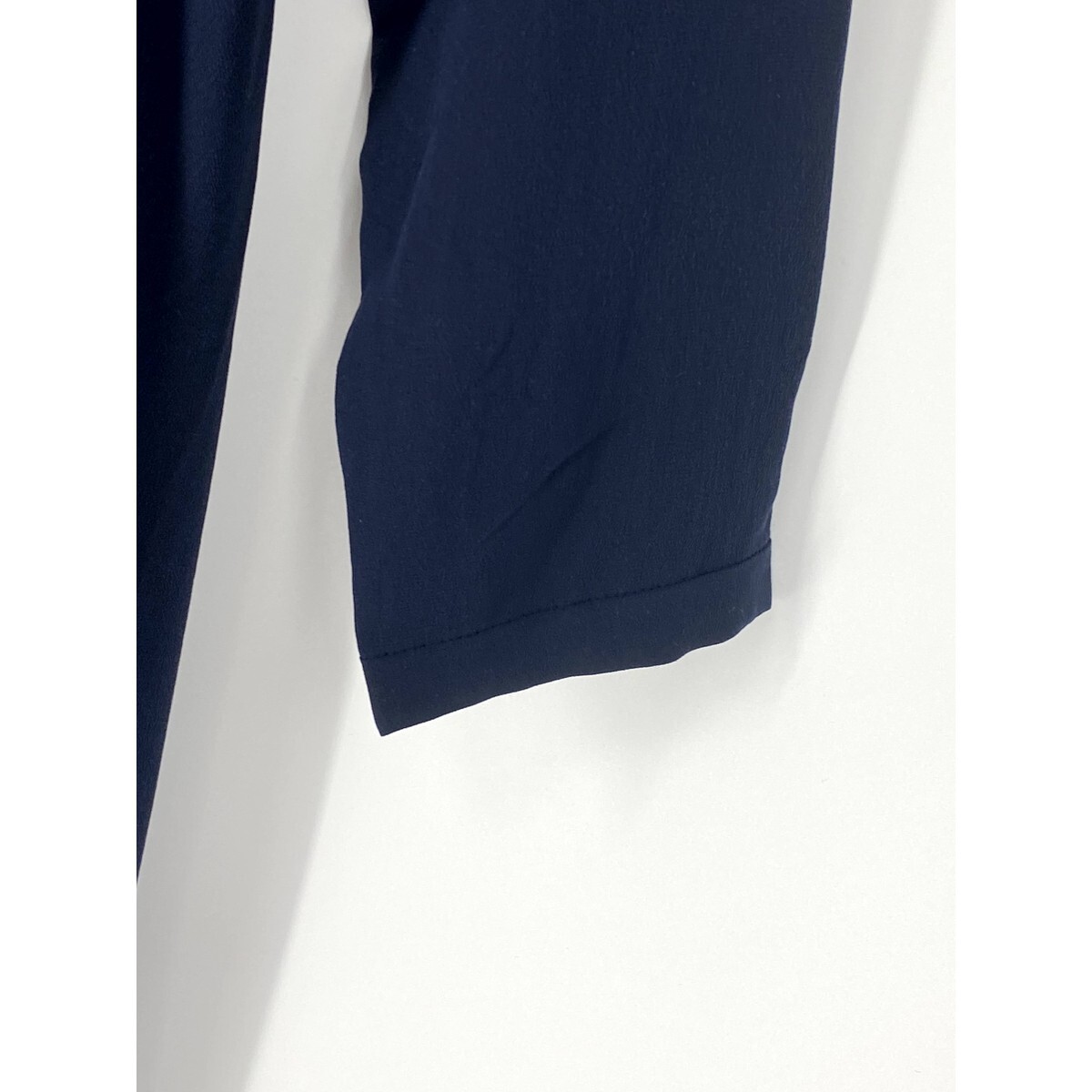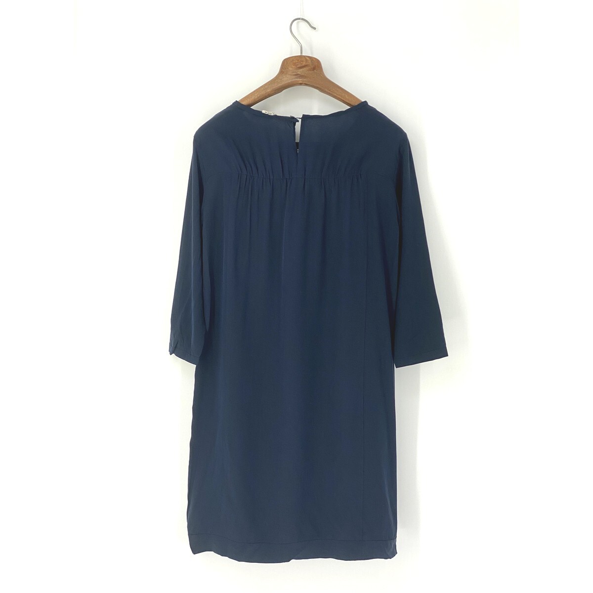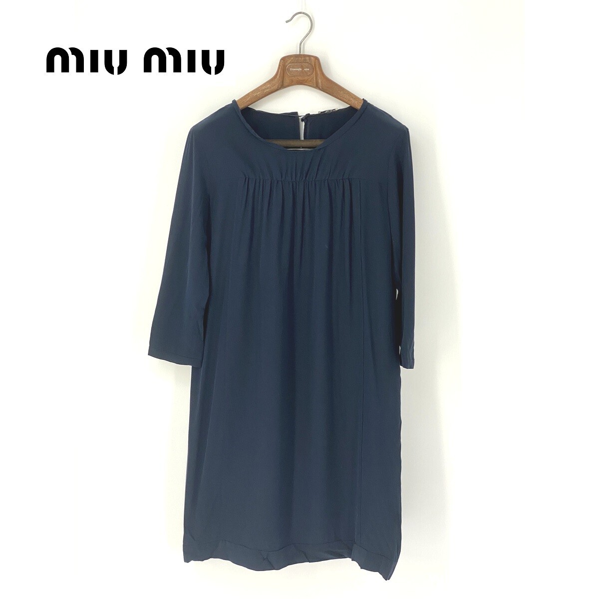 A6925/極美品 春夏 MIU MIU ミュウミュウ シルク100% 無地 ギャザー 長袖 ドレス ストレート ロング ミモレ丈 ワンピース40濃紺/レディース
