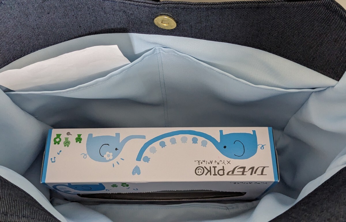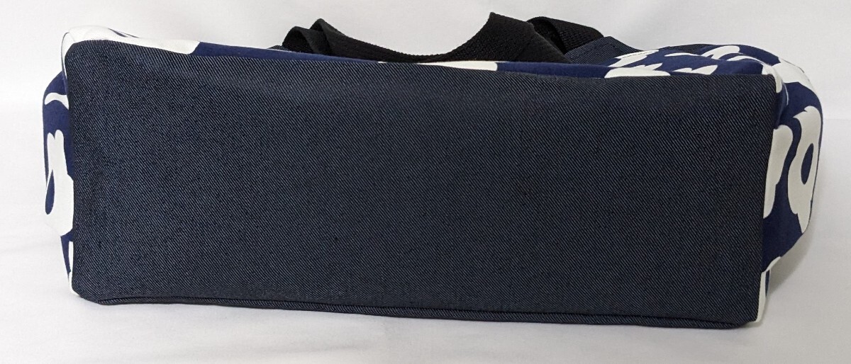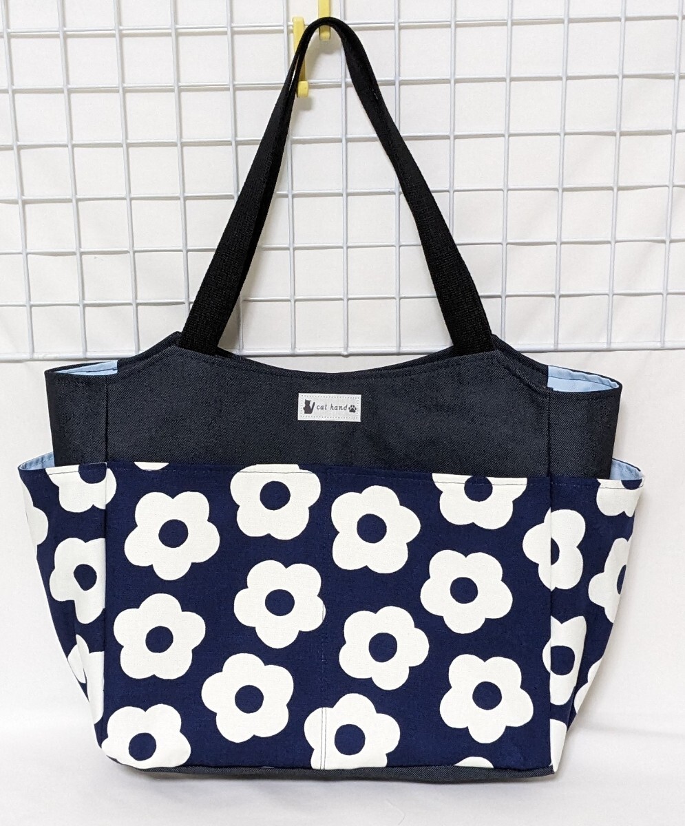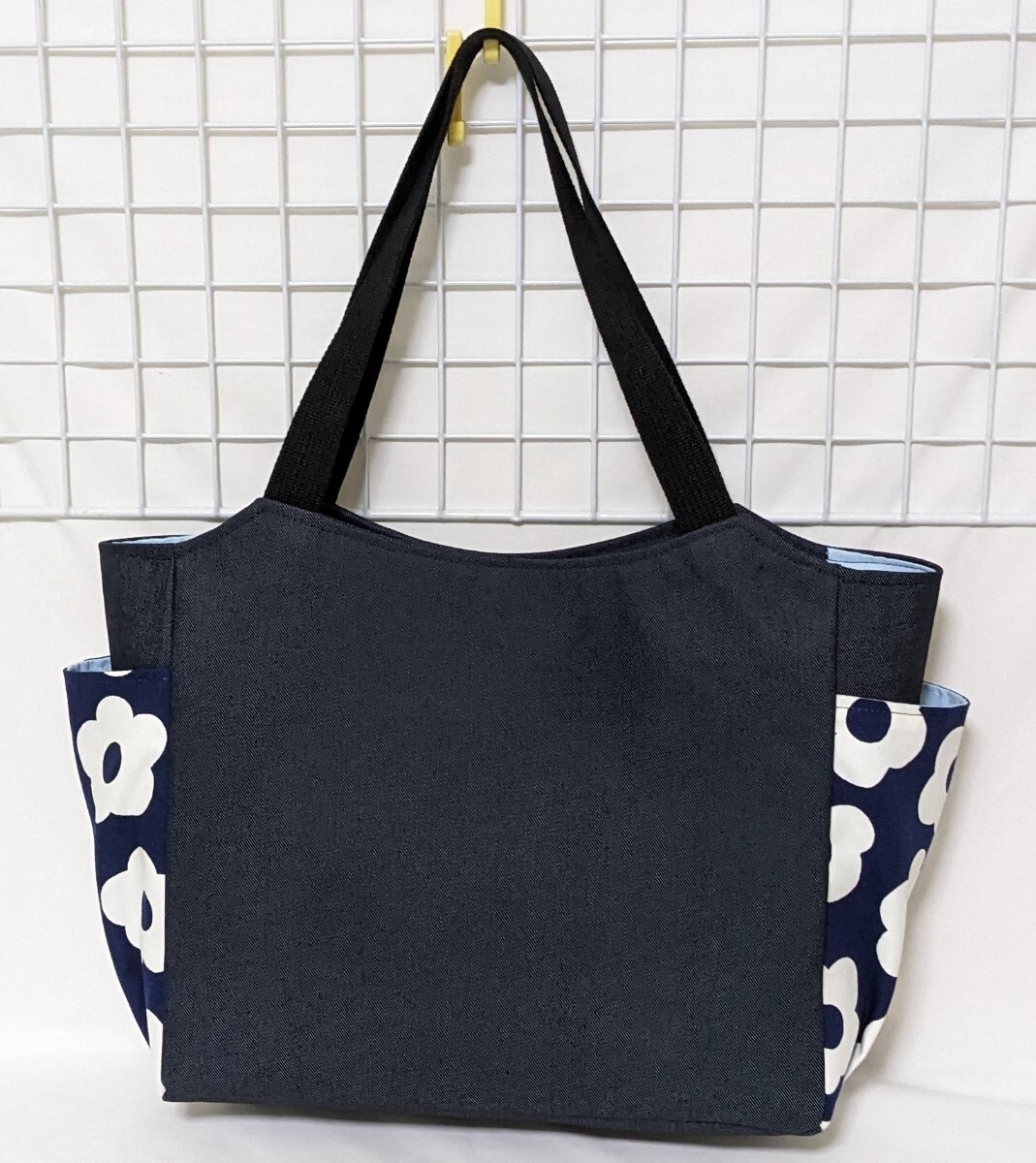 FUWARI花柄ネイビー・デニムインディゴネイビーのサイドポケット付トートバッグ・ハンドメイド