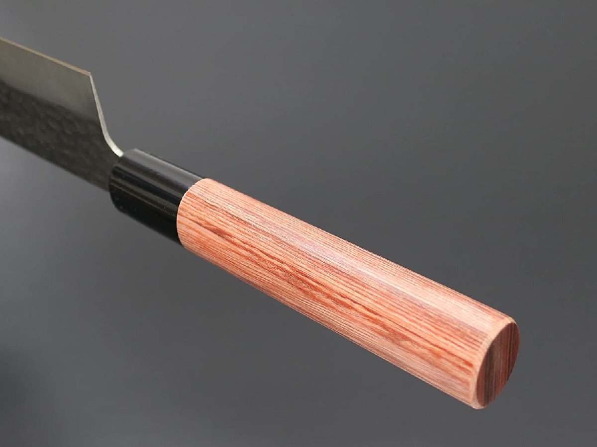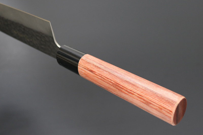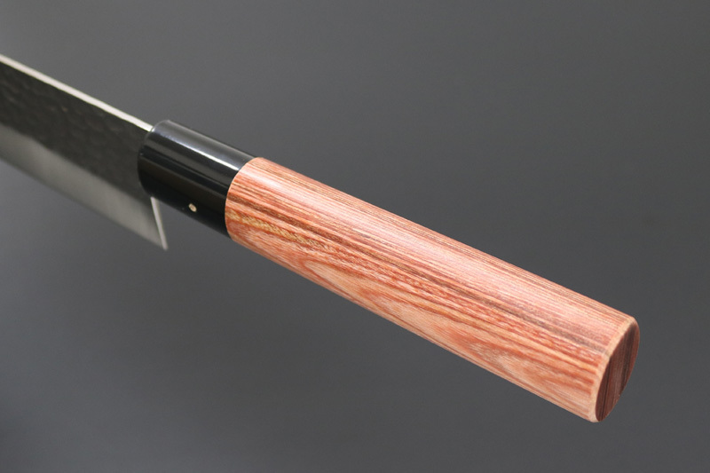 ■和包丁風のハンドルスタイル。ハンドル材は美しい木目調の赤合板材を使用。