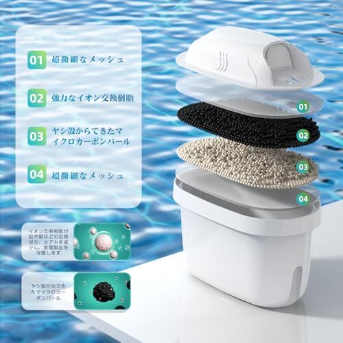 【高性能フィルター】 最新改良の超微粒子活性炭マイクロカーボンパールと高効率イオン交換樹脂を採用。カルキ臭や塩素臭をはじめ、CAT(農薬)、溶解性鉛、各種トリハロメタンなどの有害物質を効果的に除去し、必要なミネラルはしっかり保持。安心して飲用・料理に使える、クリアで健康な水を実現します