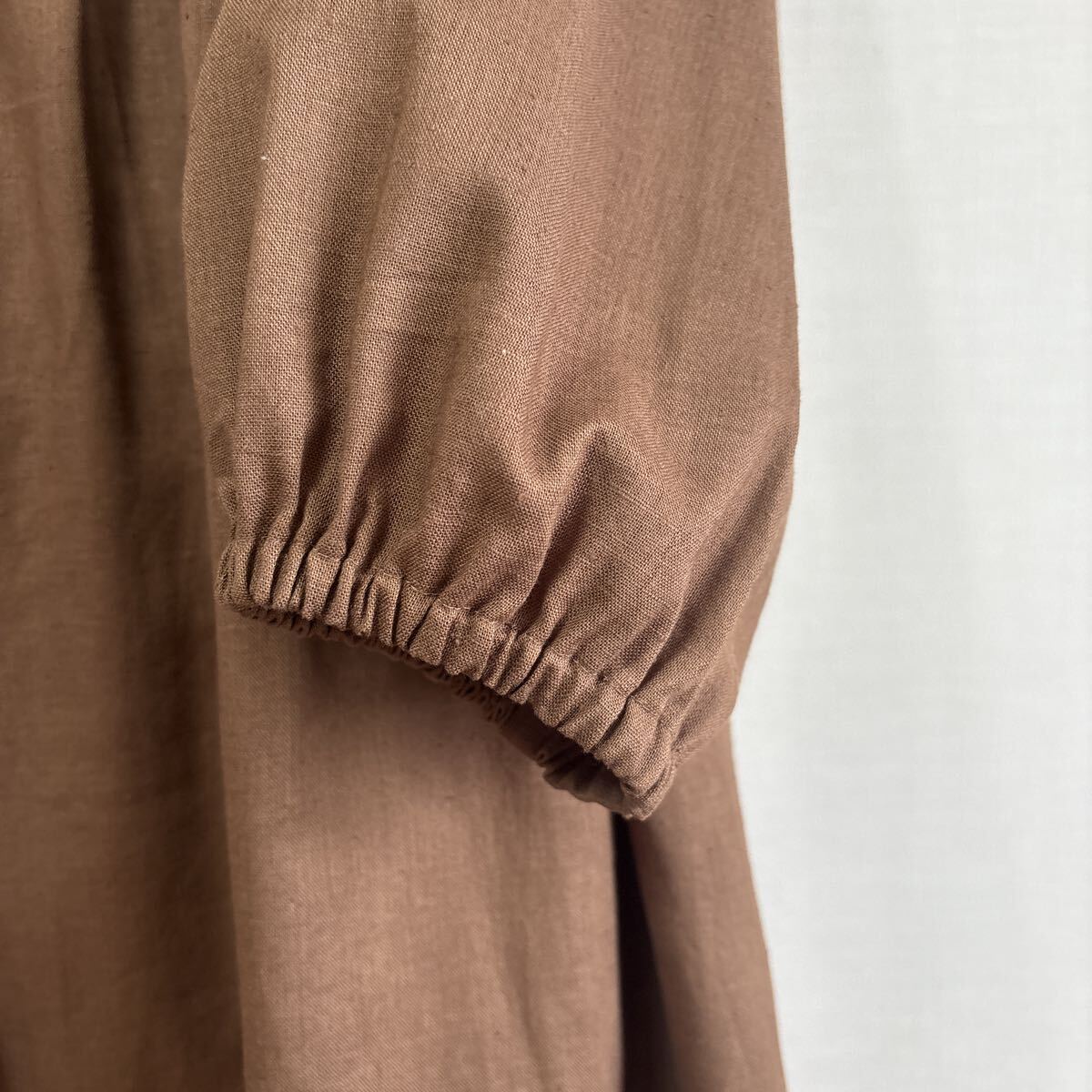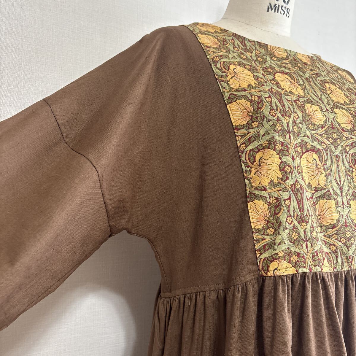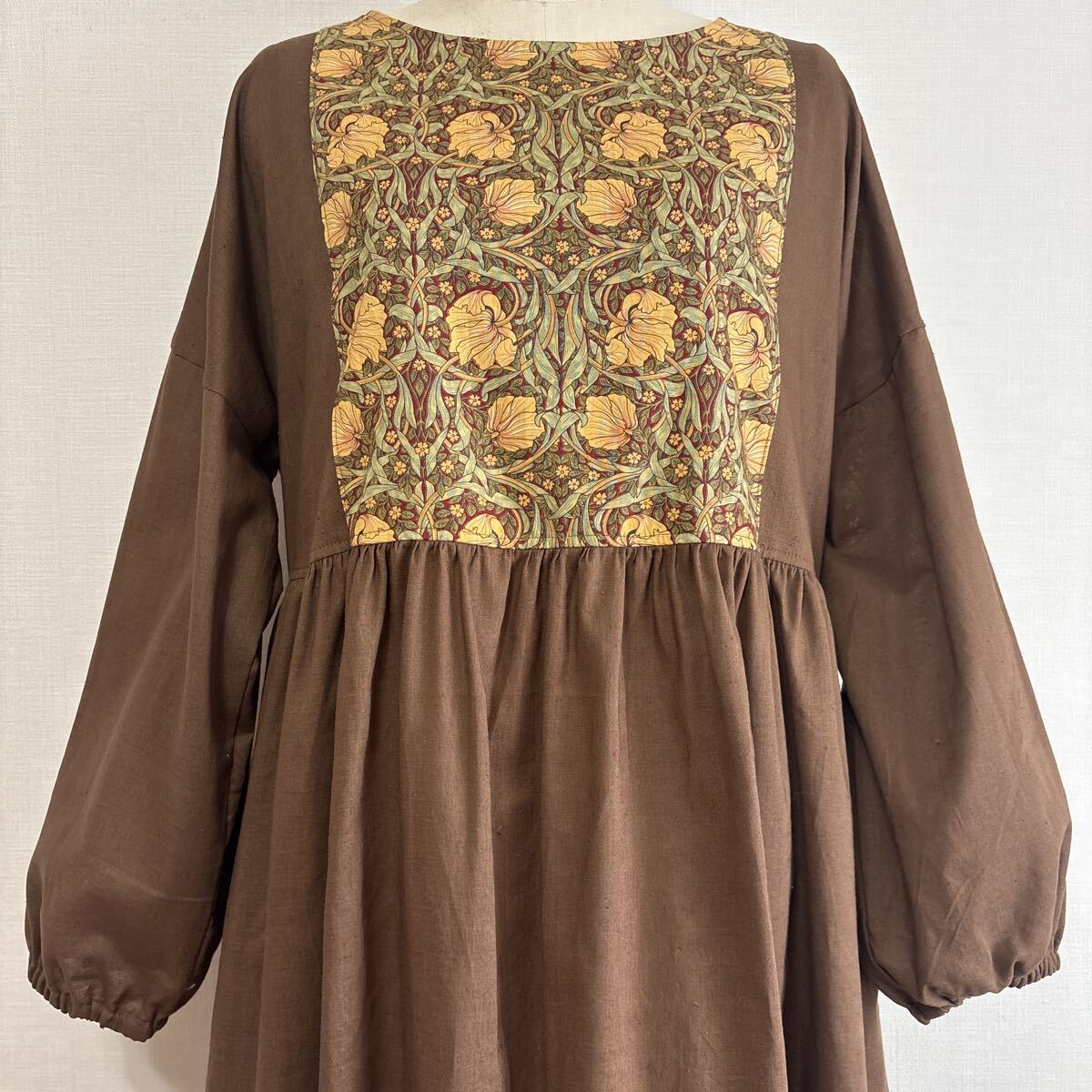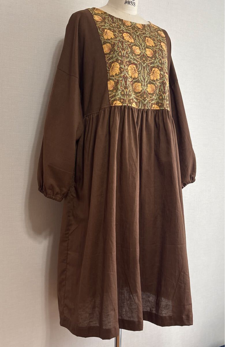 袖口にゴムを使用してぽわんとしたワンピースをお仕立て致しました。秋はやっぱりブラウンですよね。秋感を感じられる作品になりました。生地はコットンリネン。薄手で柔らかい生地感です。お色はブラウン。透け感あり。気になる方はお手持ちのペチコートをお履き下さい。胸元、ポケット片側にはmoda社のピンパネル。ウィリアムモリスの生地を使用しています。身幅にゆとりがあるのでインナーも着用可能です。がばっと上から被るタイプです。伸縮性なし。ポケットあり。袖口ゴム使用。衿ぐり身返しにレースを使用しています。リネン特有のネップ、折りキズがございます。ネップが多めです。ご理解の上ご入札をお願いいたします。
