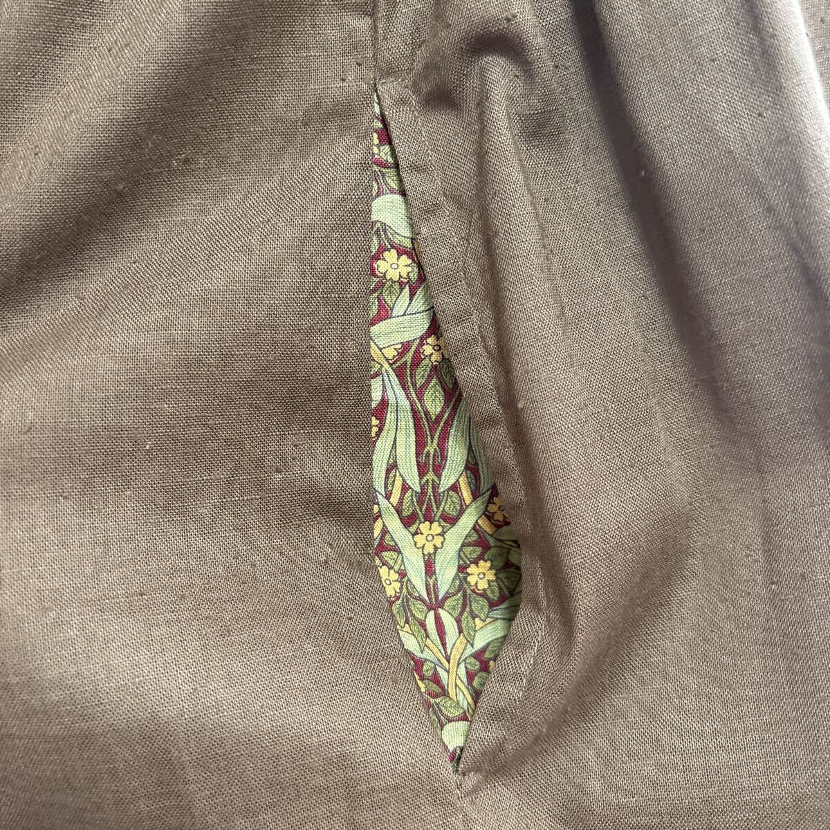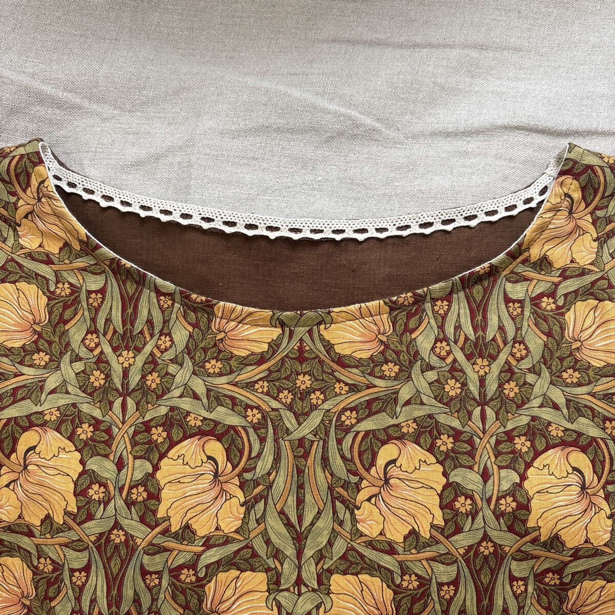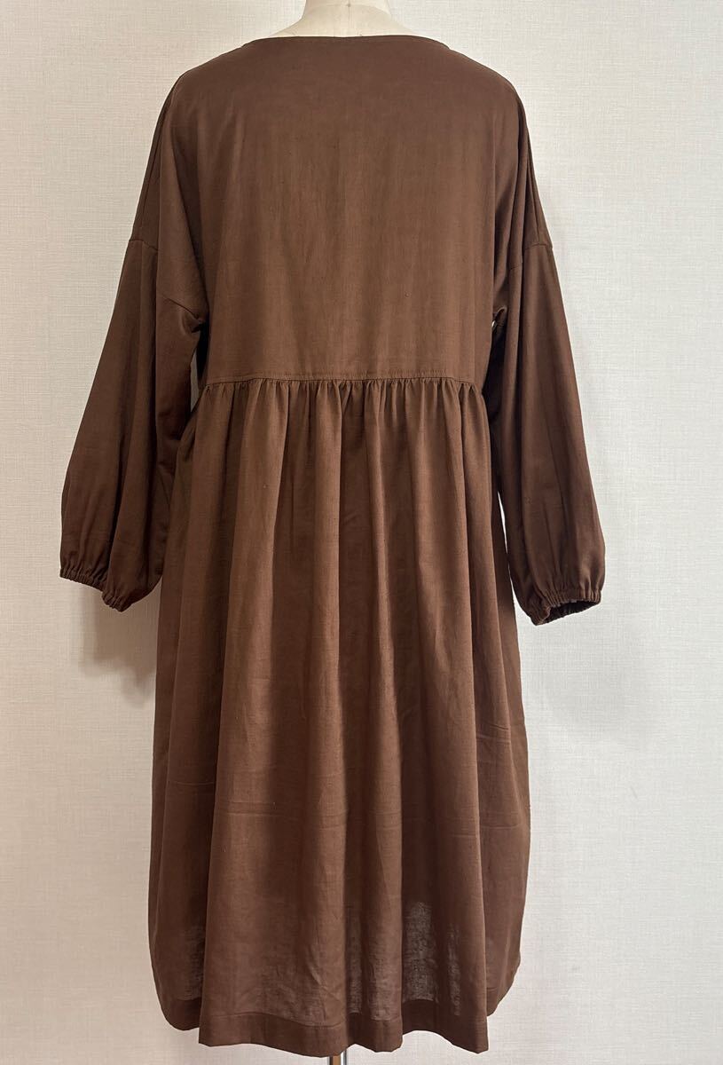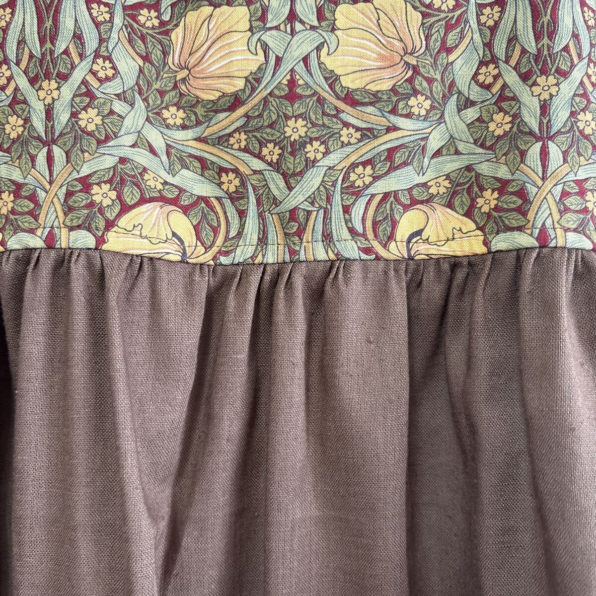 袖口にゴムを使用してぽわんとしたワンピースをお仕立て致しました。秋はやっぱりブラウンですよね。秋感を感じられる作品になりました。生地はコットンリネン。薄手で柔らかい生地感です。お色はブラウン。透け感あり。気になる方はお手持ちのペチコートをお履き下さい。胸元、ポケット片側にはmoda社のピンパネル。ウィリアムモリスの生地を使用しています。身幅にゆとりがあるのでインナーも着用可能です。がばっと上から被るタイプです。伸縮性なし。ポケットあり。袖口ゴム使用。衿ぐり身返しにレースを使用しています。リネン特有のネップ、折りキズがございます。ネップが多めです。ご理解の上ご入札をお願いいたします。