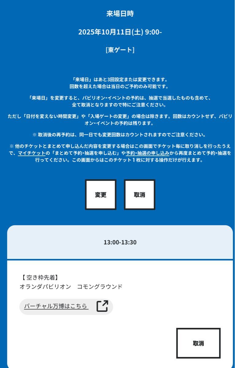 3日前空き枠先着予約でオランダパピリオン コモングラウンド13:00-13:20予約済み