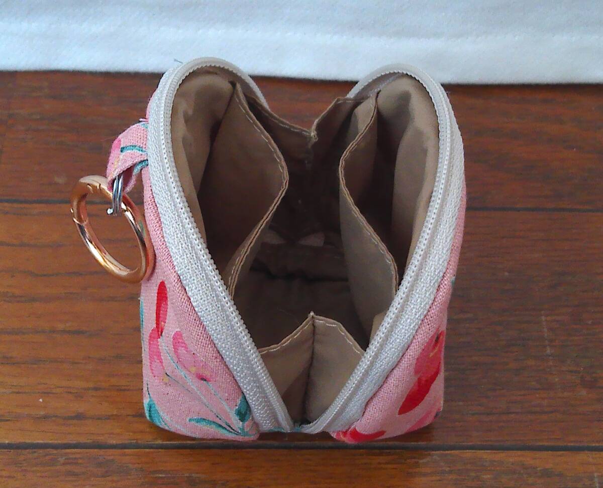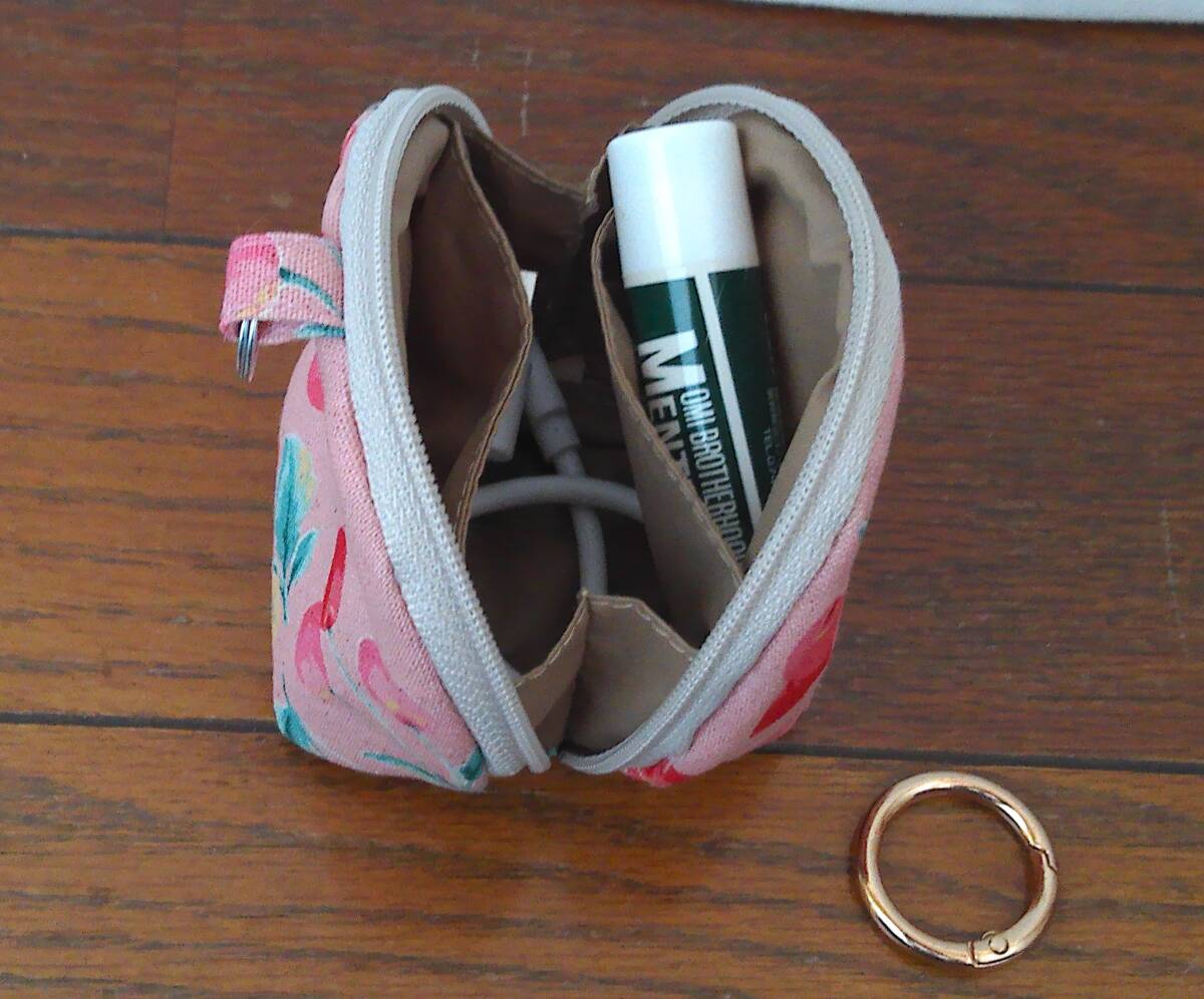 リングタブに丸いカラビナを付けた小さなポーチです。 |