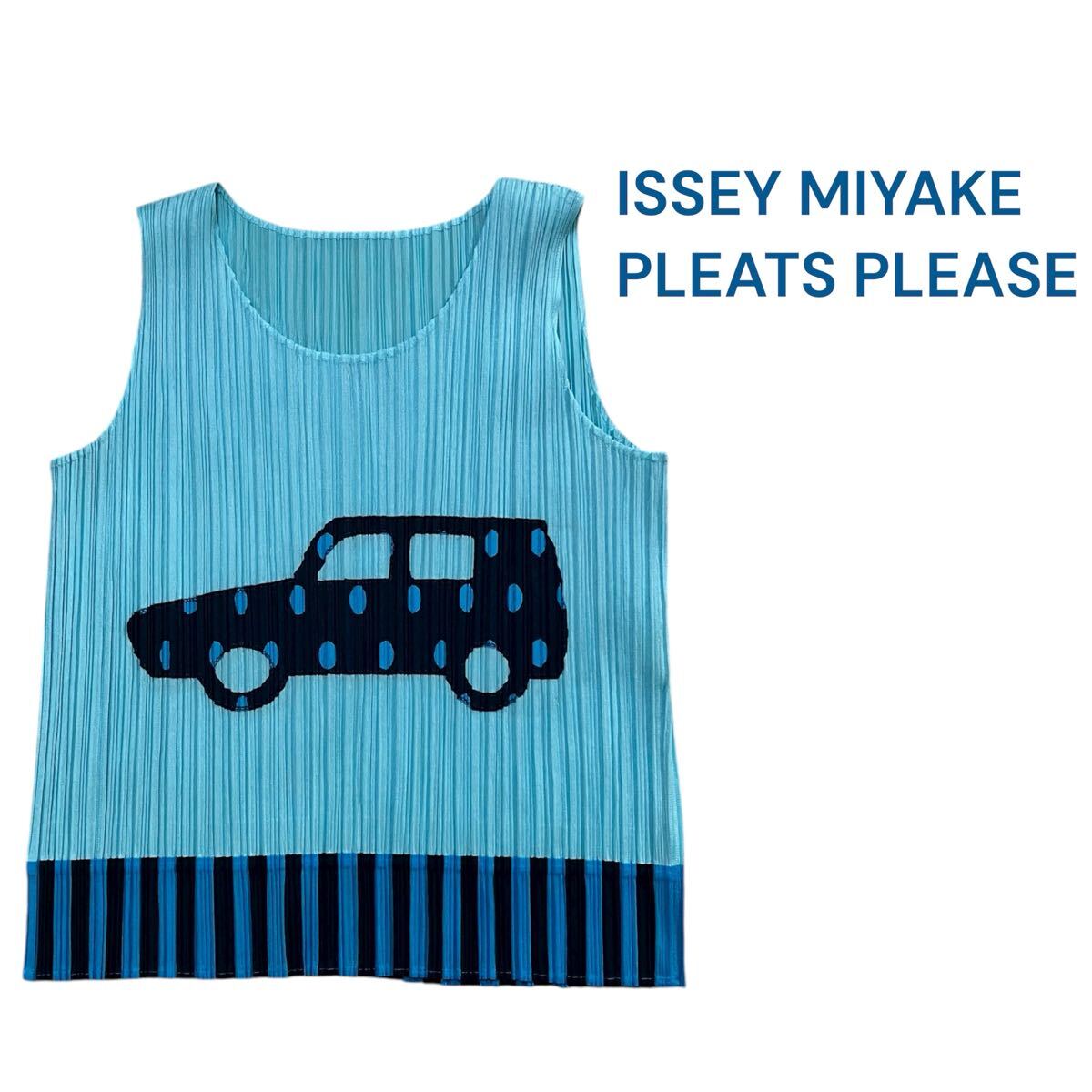 水色のプリーツ加工ノースリーブトップス、車のデザインが特徴的。